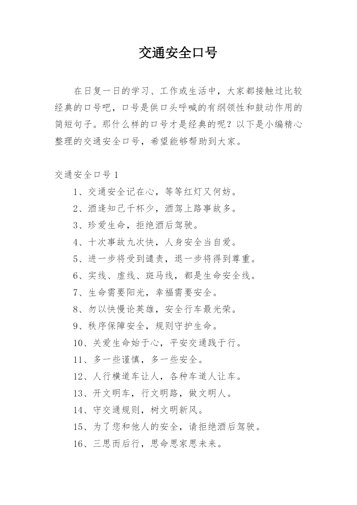 交通安全口号在日复一日的学习、工作或生活中,大家都接触过比较经典的口号吧,口号是供口头呼喊的有纲领性和鼓动作用的简短句子。那什么样的口号才是经典的呢?以下是小编精心整理的交通安全口号,希望能够帮助到大家。交通安全口号11、交通安全记在心,等等红灯又何妨。2、酒逢知己千杯少,酒驾上路事故多。3、珍爱生命,拒绝酒后驾驶。4、十次事故九次快,人身安全当自爱。5、进一步将受到谴责,退一步将得到尊重。6、实线、虚线、斑马线,都是生命安全线。7、生命需要阳光,幸福需要安全。8、勿以快慢论英雄,安全行车最光荣。9、秩序