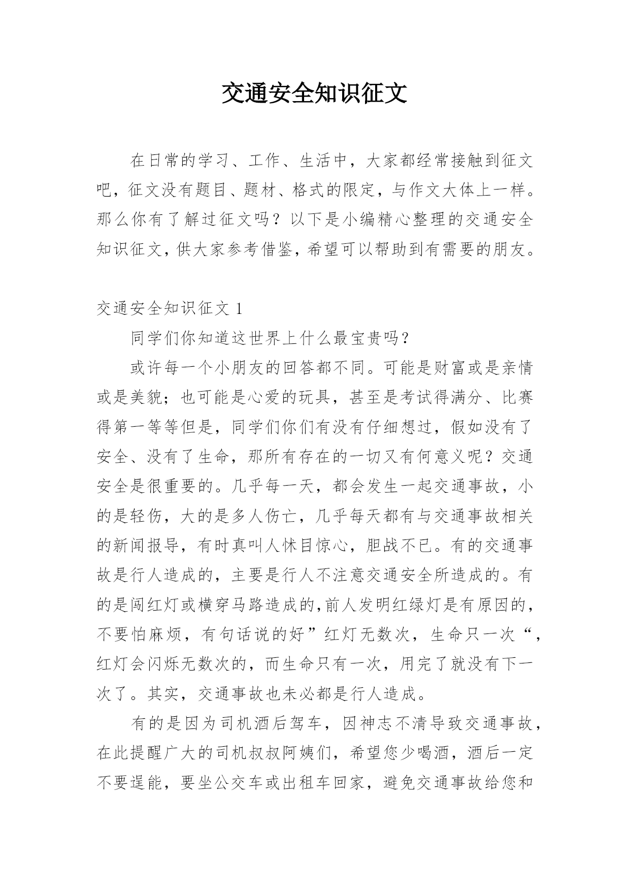 交通安全知识征文在日常的学习、工作、生活中,大家都经常接触到征文吧,征文没有题目、题材、格式的限定,与作文大体上一样。那么你有了解过征文吗?以下是小编精心整理的交通安全知识征文,供大家参考借鉴,希望可以帮助到有需要的朋友。交通安全知识征文1同学们你知道这世界上什么最宝贵吗?或许每一个小朋友的回答都不同。可能是财富或是亲情或是美貌;也可能是心爱的玩具,甚至是考试得满分、比赛得第一等等但是,同学们你们有没有仔细想过,假如没有了安全、没有了生命,那所有存在的一切又有何意义呢?交通安全是很重要的。几乎每一天,都会