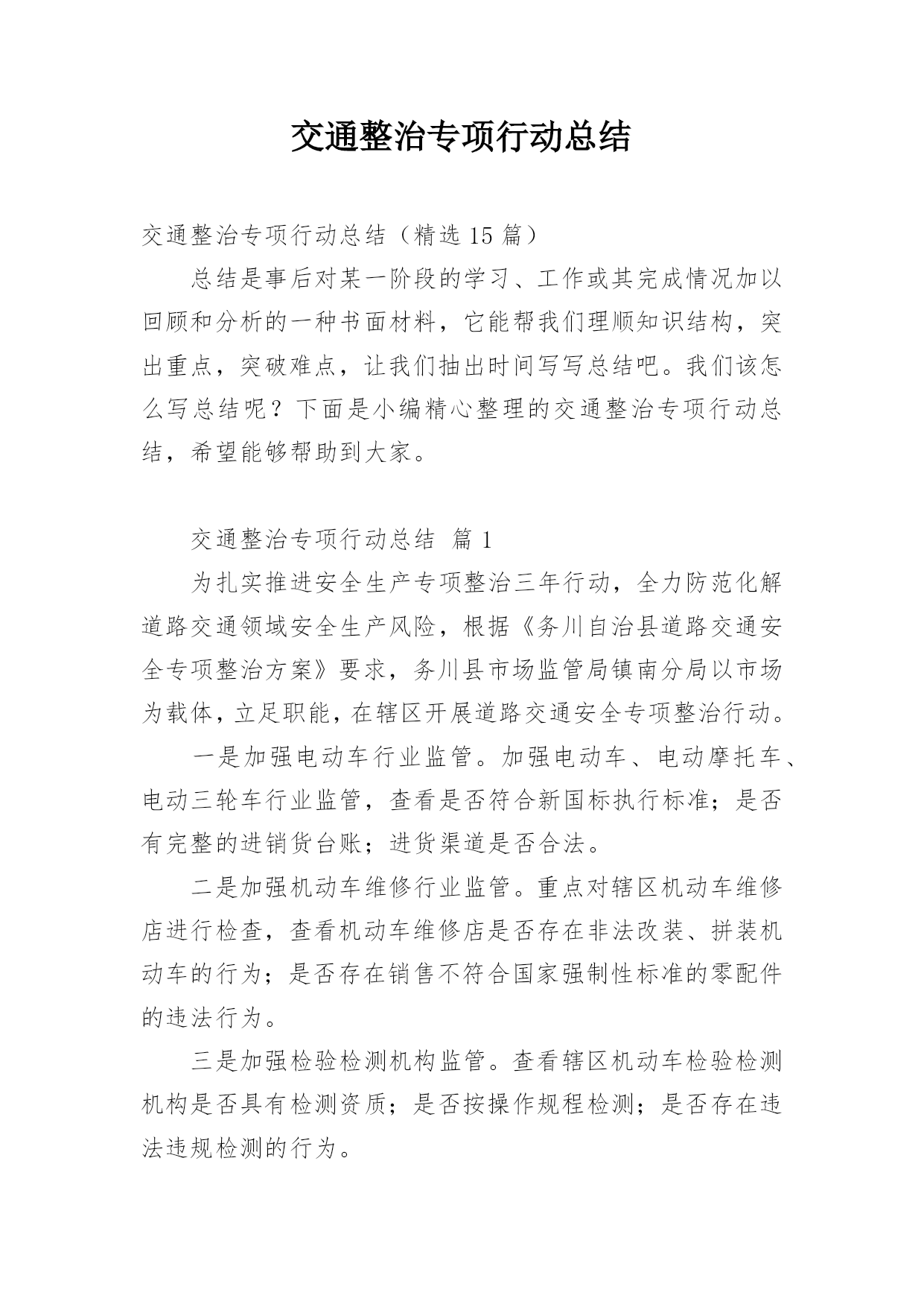 交通整治专项行动总结交通整治专项行动总结(精选15篇)总结是事后对某一阶段的学习、工作或其完成情况加以回顾和分析的一种书面材料,它能帮我们理顺知识结构,突出重点,突破难点,让我们抽出时间写写总结吧。我们该怎么写总结呢?下面是小编精心整理的交通整治专项行动总结,希望能够帮助到大家。交通整治专项行动总结篇1为扎实推进安全生产专项整治三年行动,全力防范化解道路交通领域安全生产风险,根据《务川自治县道路交通安全专项整治方案》要求,务川县市场监管局镇南分局以市场为载体,立足职能,在辖区开展道路交通安全专项整治行动。