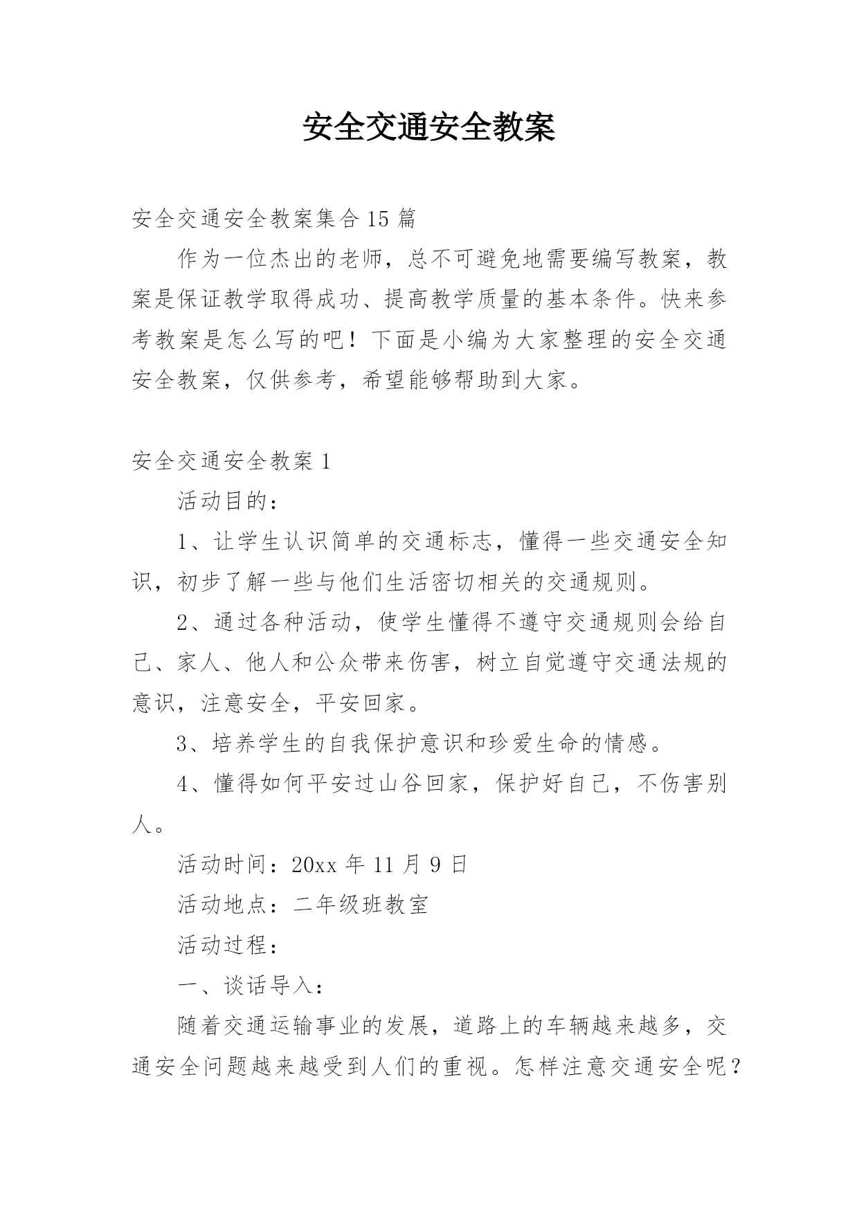 安全交通安全教案安全交通安全教案集合15篇作为一位杰出的老师,总不可避免地需要编写教案,教案是保证教学取得成功、提高教学质量的基本条件。快来参考教案是怎么写的吧!下面是小编为大家整理的安全交通安全教案,仅供参考,希望能够帮助到大家。安全交通安全教案1活动目的:1、让学生认识简单的交通标志,懂得一些交通安全知识,初步了解一些与他们生活密切相关的交通规则。2、通过各种活动,使学生懂得不遵守交通规则会给自己、家人、他人和公众带来伤害,树立自觉遵守交通法规的意识,注意安全,平安回家。3、培养学生的自我保护意识和珍