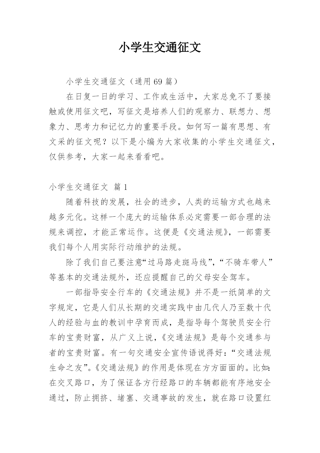 小学生交通征文小学生交通征文(通用69篇)在日复一日的学习、工作或生活中,大家总免不了要接触或使用征文吧,写征文是培养人们的观察力、联想力、想象力、思考力和记忆力的重要手段。如何写一篇有思想、有文采的征文呢?以下是小编为大家收集的小学生交通征文,仅供参考,大家一起来看看吧。小学生交通征文篇1随着科技的发展,社会的进步,人类的运输方式也越来越多元化。这样一个庞大的运输体系必定需要一部合理的法规来调控,才能正常运作。这便是《交通法规》,一部需要我们每个人用实际行动维护的法规。除了我们自己要注意“过马路走斑马线