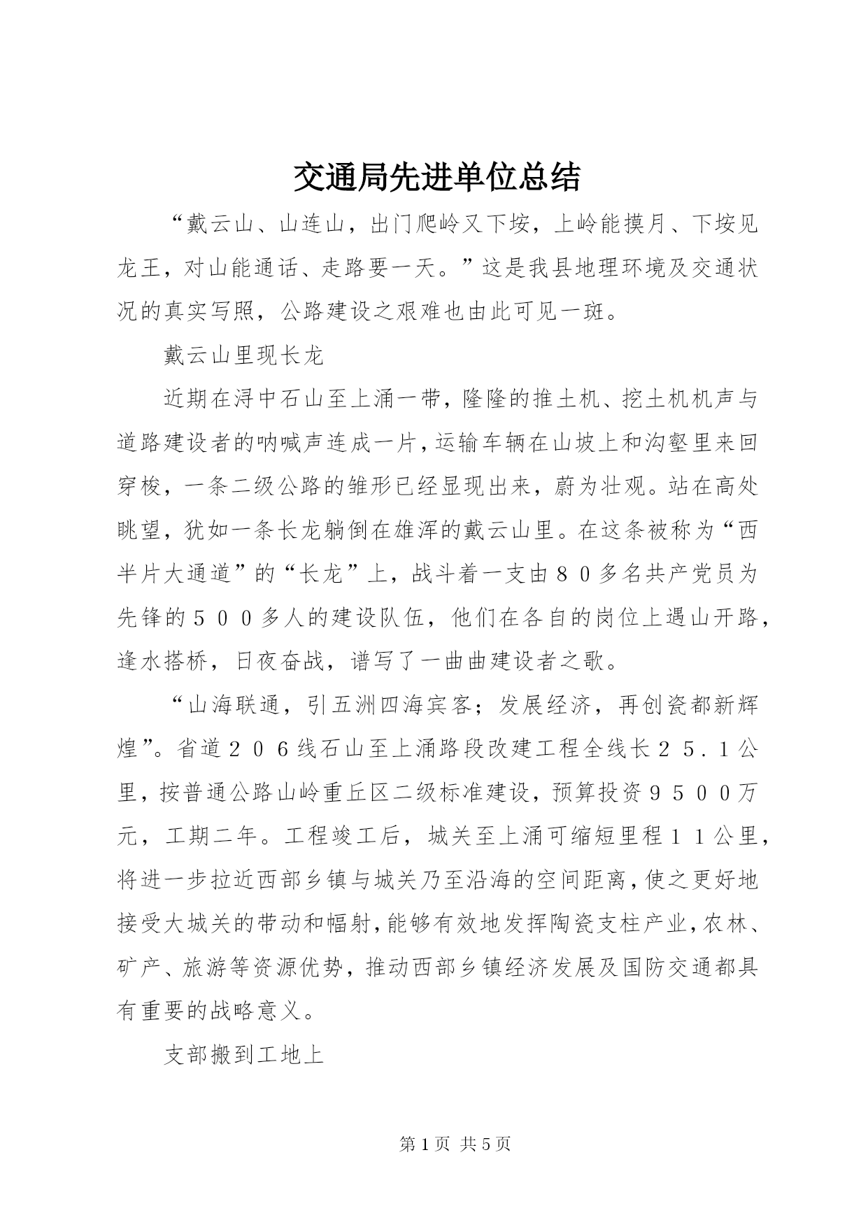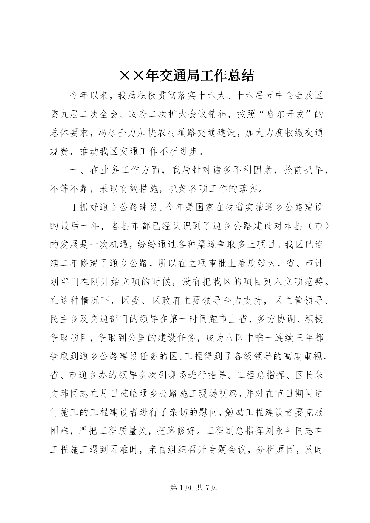 第PAGE\*Arabic\*MERGEFORMAT7页共NUMPAGES\*MERGEFORMAT7页××年交通局工作总结今年以来,我局积极贯彻落实十六大、十六届五中全会及区委九届二次全会、政府二次扩大会议精神,按照“哈东开发”的总体要求,竭尽全力加快农村道路交通建设,加大力度收缴交通规费,推动我区交通工作不断进步。一、在业务工作方面,我局针对诸多不利因素,抢前抓早,不等不靠,采取有效措施,抓好各项工作的落实。⒈抓好通乡公路建设。今年是国家在我省实施通乡公路建设的最后一年,各县市都已经认识到