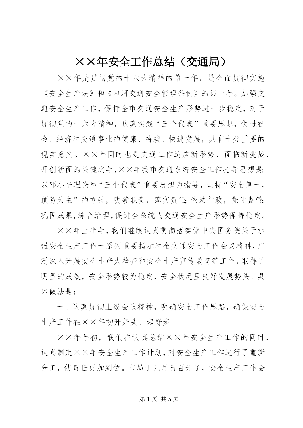 第PAGE\*Arabic\*MERGEFORMAT5页共NUMPAGES\*MERGEFORMAT5页××年安全工作总结(交通局)××年是贯彻党的十六大精神的第一年,是全面贯彻实施《安全生产法》和《内河交通安全管理条例》的第一年。加强交通安全生产工作,保持全市交通安全生产形势进一步稳定,对于贯彻党的十六大精神,认真实践“三个代表”重要思想,促进社会、经济和交通事业的健康、持续、快速发展,具有十分重要的现实意义。××年同时也是交通工作适应新形势、面临新挑战、开创新面的关键之年,××年我市交通系
