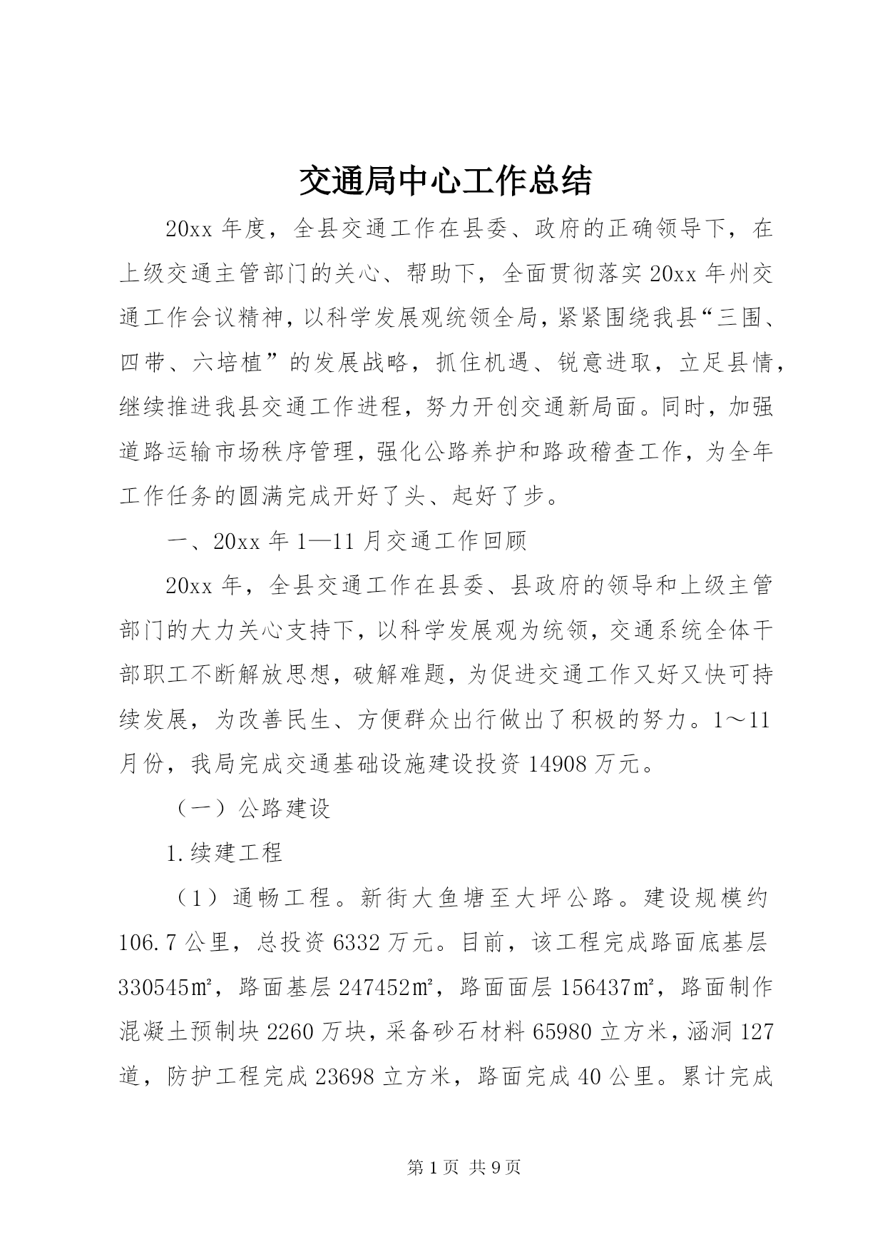 第PAGE\*Arabic\*MERGEFORMAT9页共NUMPAGES\*MERGEFORMAT9页交通局中心工作总结20xx年度,全县交通工作在县委、政府的正确领导下,在上级交通主管部门的关心、帮助下,全面贯彻落实20xx年州交通工作会议精神,以科学发展观统领全局,紧紧围绕我县“三围、四带、六培植”的发展战略,抓住机遇、锐意进取,立足县情,继续推进我县交通工作进程,努力开创交通新局面。同时,加强道路运输市场秩序管理,强化公路养护和路政稽查工作,为全年工作任务的圆满完成开好了头、起好了步。