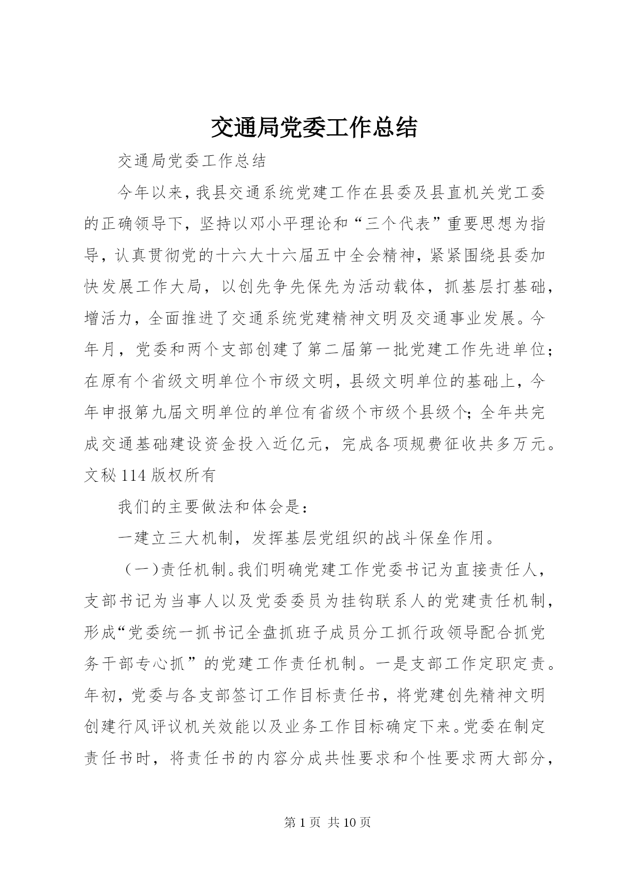 第PAGE\*Arabic\*MERGEFORMAT10页共NUMPAGES\*MERGEFORMAT10页交通局党委工作总结交通局党委工作总结今年以来,我县交通系统党建工作在县委及县直机关党工委的正确领导下,坚持以邓小平理论和“三个代表”重要思想为指导,认真贯彻党的十六大十六届五中全会精神,紧紧围绕县委加快发展工作大局,以创先争先保先为活动载体,抓基层打基础,增活力,全面推进了交通系统党建精神文明及交通事业发展。今年月,党委和两个支部创建了第二届第一批党建工作先进单位;在原有个省级文明单位个