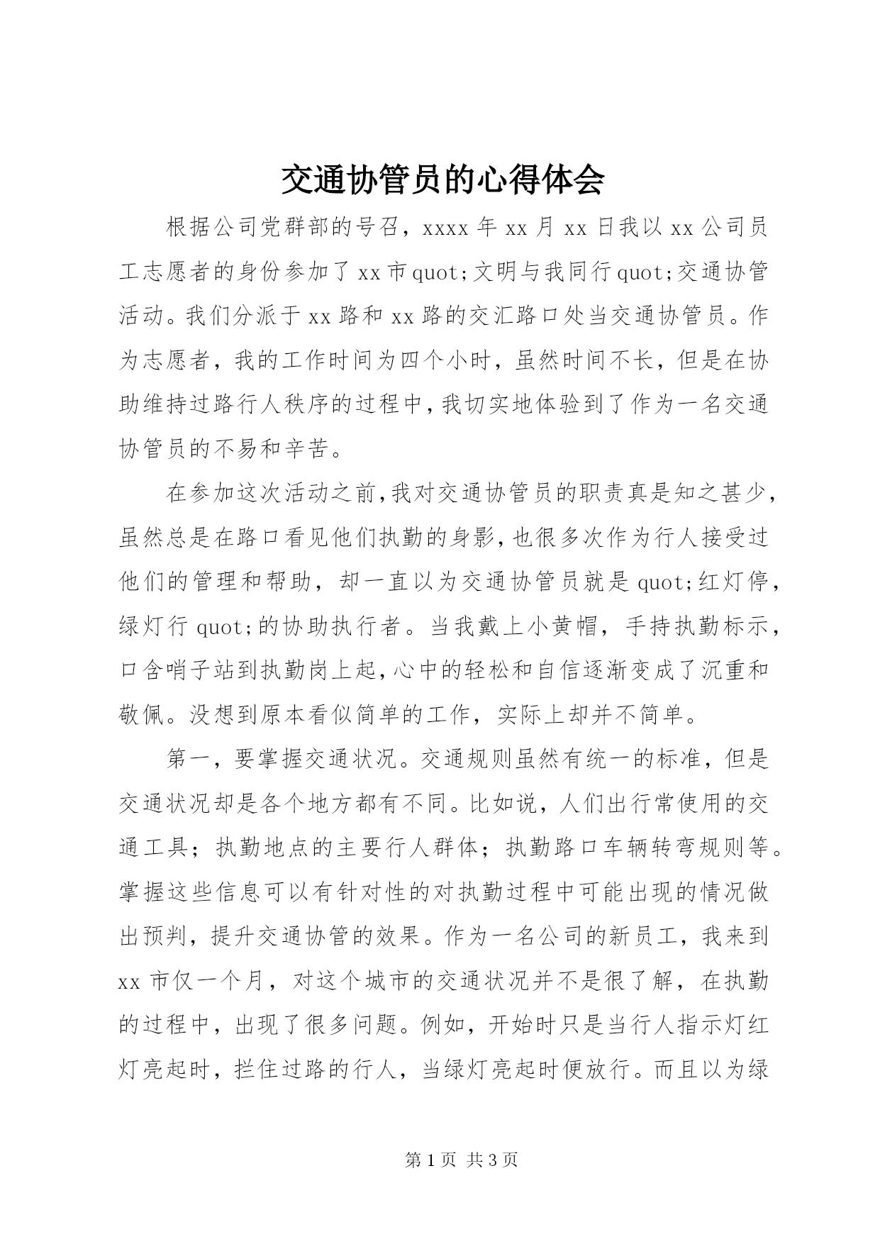 第PAGE\*Arabic\*MERGEFORMAT3页共NUMPAGES\*MERGEFORMAT3页交通协管员的心得体会根据公司党群部的号召,xxxx年xx月xx日我以xx公司员工志愿者的身份参加了xx市quot;文明与我同行quot;交通协管活动。我们分派于xx路和xx路的交汇路口处当交通协管员。作为志愿者,我的工作时间为四个小时,虽然时间不长,但是在协助维持过路行人秩序的过程中,我切实地体验到了作为一名交通协管员的不易和辛苦。在参加这次活动之前,我对交通协管员的职责真是知之甚少,虽然总