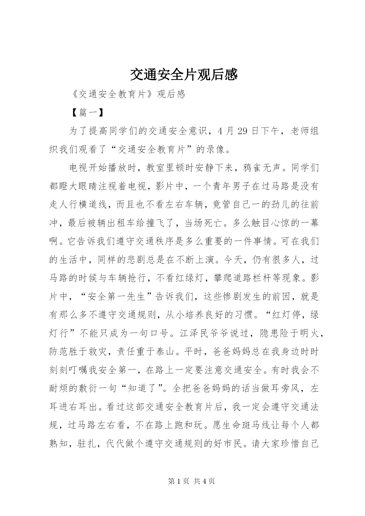 第PAGE\*Arabic\*MERGEFORMAT4页共NUMPAGES\*MERGEFORMAT4页交通安全片观后感《交通安全教育片》观后感【篇一】为了提高同学们的交通安全意识,4月29日下午,老师组织我们观看了“交通安全教育片”的录像。电视开始播放时,教室里顿时安静下来,鸦雀无声。同学们都瞪大眼睛注视着电视,影片中,一个青年男子在过马路是没有走人行横道线,而且也不看左右车辆,竟管自己一的劲儿的往前冲,最后被辆出租车给撞飞了,当场死亡。多么触目心惊的一幕啊。它告诉我们遵守交通秩序是多么重要