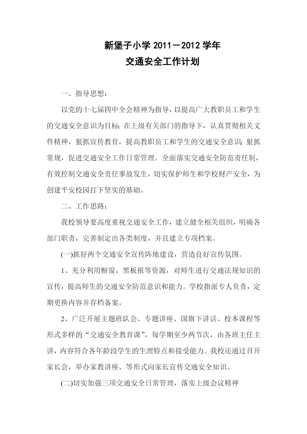 新堡子小学2011-2012学年交通安全工作计划一、指导思想:以党的十七届四中全会精神为指导,以提高广大教职员工和学生的交通安全意识为目标;在上级有关部门的指导下,认真贯彻相关文件精神,狠抓宣传教育,提高教职员工和学生的交通安全意识;狠抓常规,促进交通安全工作日常管理。全面落实交通安全防范责任制,有效控制交通安全责任事故发生,切实保护师生和学校财产安全,为创建平安校园打下坚实的基础。二、工作思路:我校领导要高度重视交通安全工作,建立健全相关组织,明确各部门职责,完善制定出各类制度,并且建立专项档案。(一)