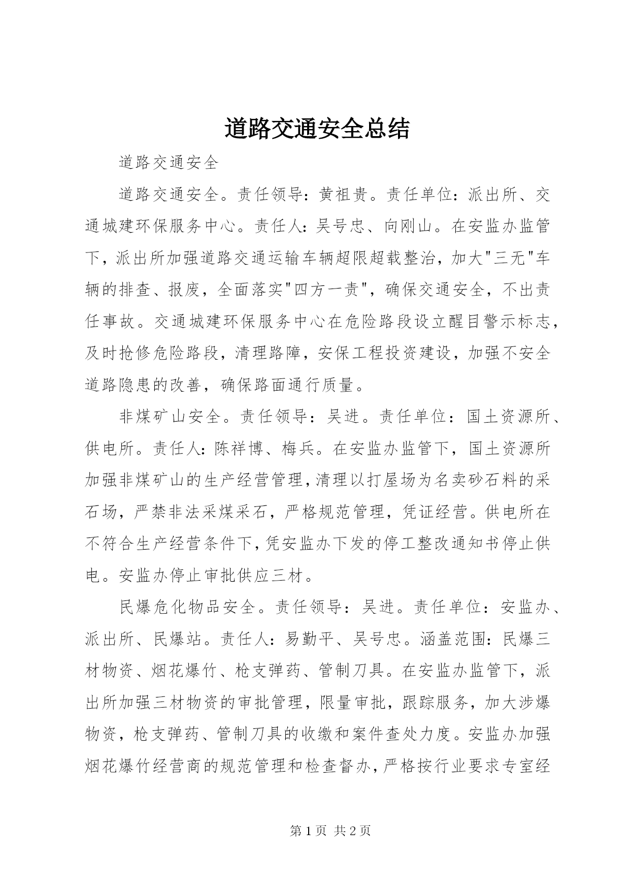 第PAGE\*Arabic\*MERGEFORMAT2页共NUMPAGES\*MERGEFORMAT2页道路交通安全总结道路交通安全道路交通安全。责任领导:黄祖贵。责任单位:派出所、交通城建环保服务中心。责任人:吴号忠、向刚山。在安监办监管下,派出所加强道路交通运输车辆超限超载整治,加大"三无"车辆的排查、报废,全面落实"四方一责",确保交通安全,不出责任事故。交通城建环保服务中心在危险路段设立醒目警示标志,及时抢修危险路段,清理路障,安保工程投资建设,加强不安全道路隐患的改善,确保路面通行质