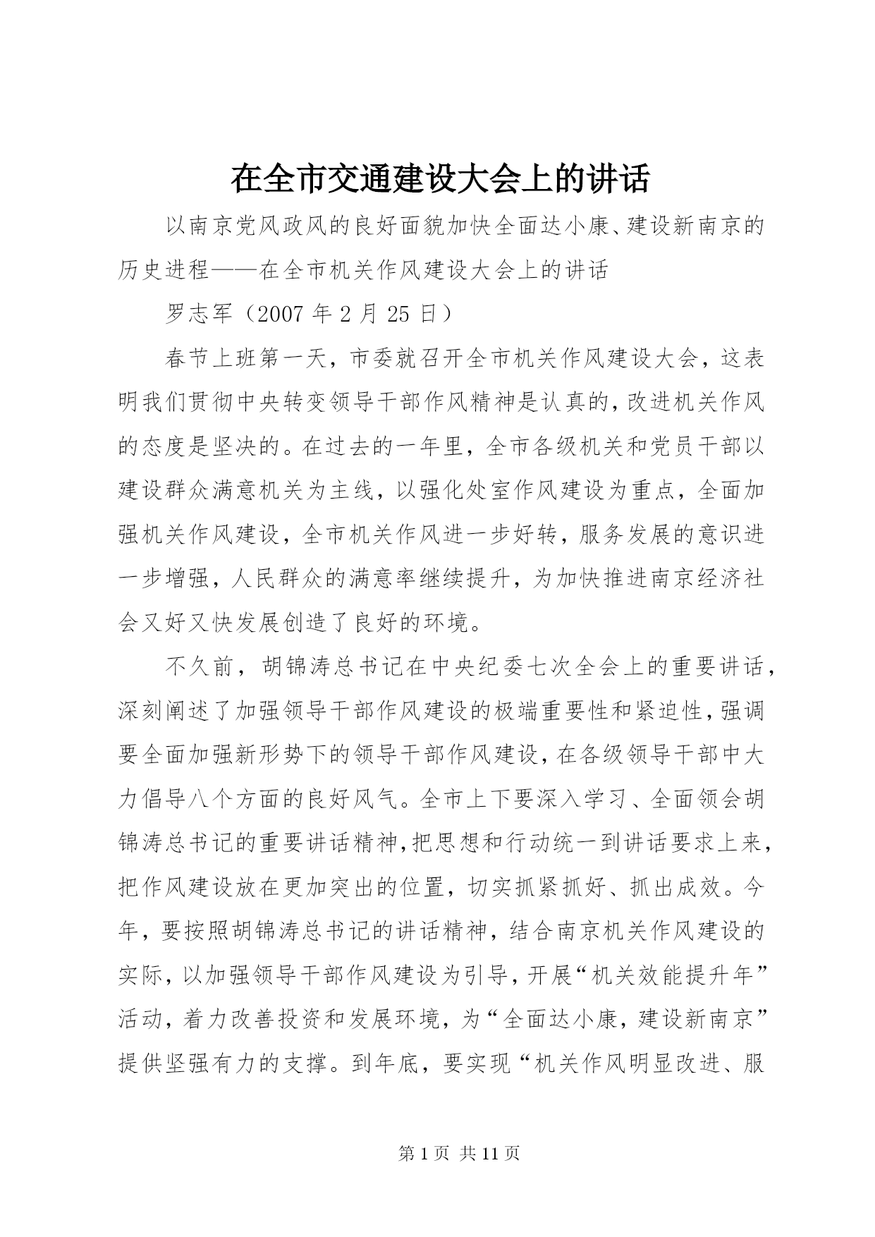 第PAGE\*Arabic\*MERGEFORMAT11页共NUMPAGES\*MERGEFORMAT11页在全市交通建设大会上的讲话以南京党风政风的良好面貌加快全面达小康、建设新南京的历史进程——在全市机关作风建设大会上的讲话罗志军(2007年2月25日)春节上班第一天,市委就召开全市机关作风建设大会,这表明我们贯彻中央转变领导干部作风精神是认真的,改进机关作风的态度是坚决的。在过去的一年里,全市各级机关和党员干部以建设群众满意机关为主线,以强化处室作风建设为重点,全面加强机关作风建设,全市