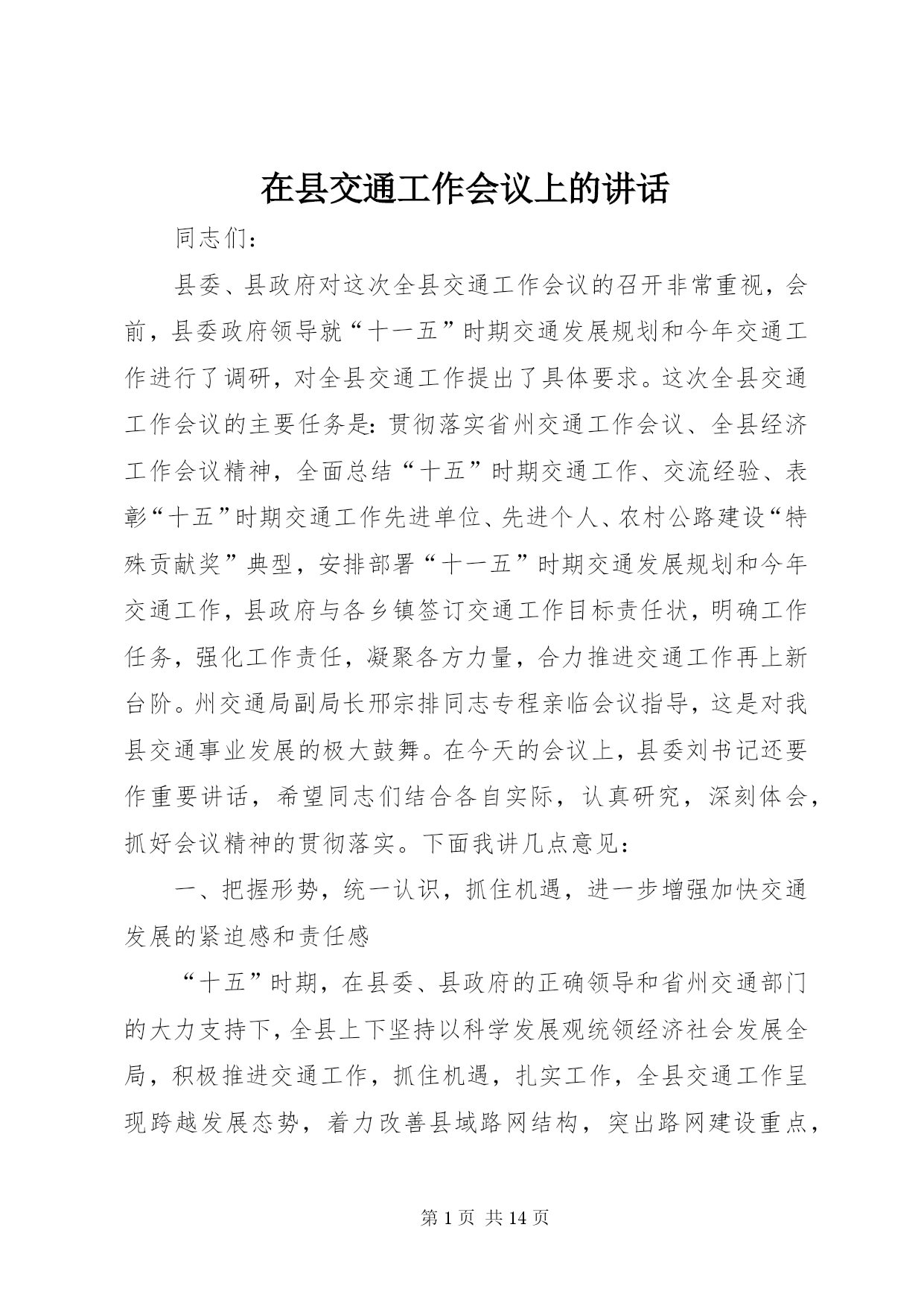 第PAGE\*Arabic\*MERGEFORMAT14页共NUMPAGES\*MERGEFORMAT14页在县交通工作会议上的讲话同志们:县委、县政府对这次全县交通工作会议的召开非常重视,会前,县委政府领导就“十一五”时期交通发展规划和今年交通工作进行了调研,对全县交通工作提出了具体要求。这次全县交通工作会议的主要任务是:贯彻落实省州交通工作会议、全县经济工作会议精神,全面总结“十五”时期交通工作、交流经验、表彰“十五”时期交通工作先进单位、先进个人、农村公路建设“特殊贡献奖”典型,安排部署