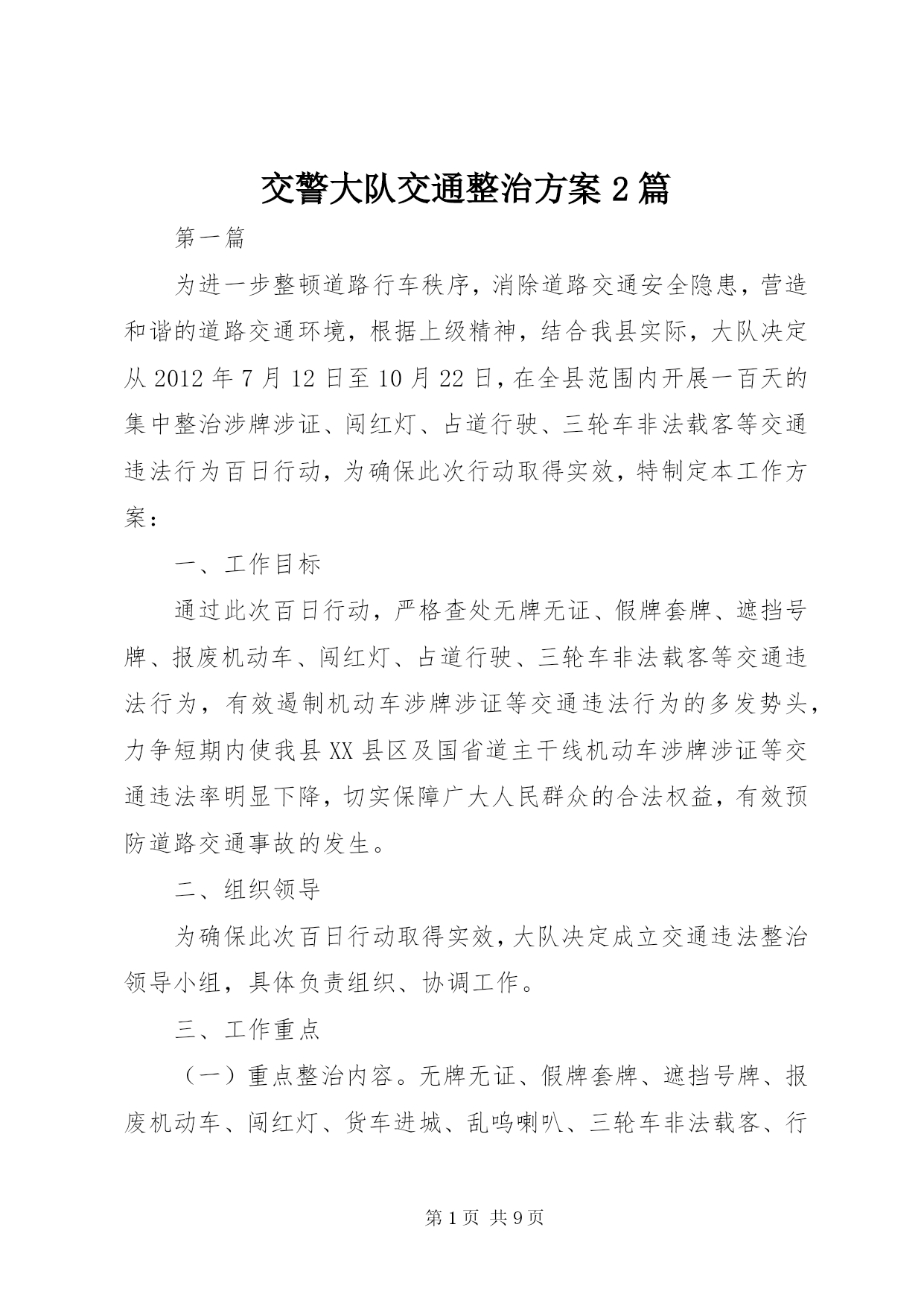 第PAGE\*Arabic\*MERGEFORMAT9页共NUMPAGES\*MERGEFORMAT9页交警大队交通整治方案2篇第一篇为进一步整顿道路行车秩序,消除道路交通安全隐患,营造和谐的道路交通环境,根据上级精神,结合我县实际,大队决定从2012年7月12日至10月22日,在全县范围内开展一百天的集中整治涉牌涉证、闯红灯、占道行驶、三轮车非法载客等交通违法行为百日行动,为确保此次行动取得实效,特制定本工作方案:一、工作目标通过此次百日行动,严格查处无牌无证、假牌套牌、遮挡号牌、报废机动车