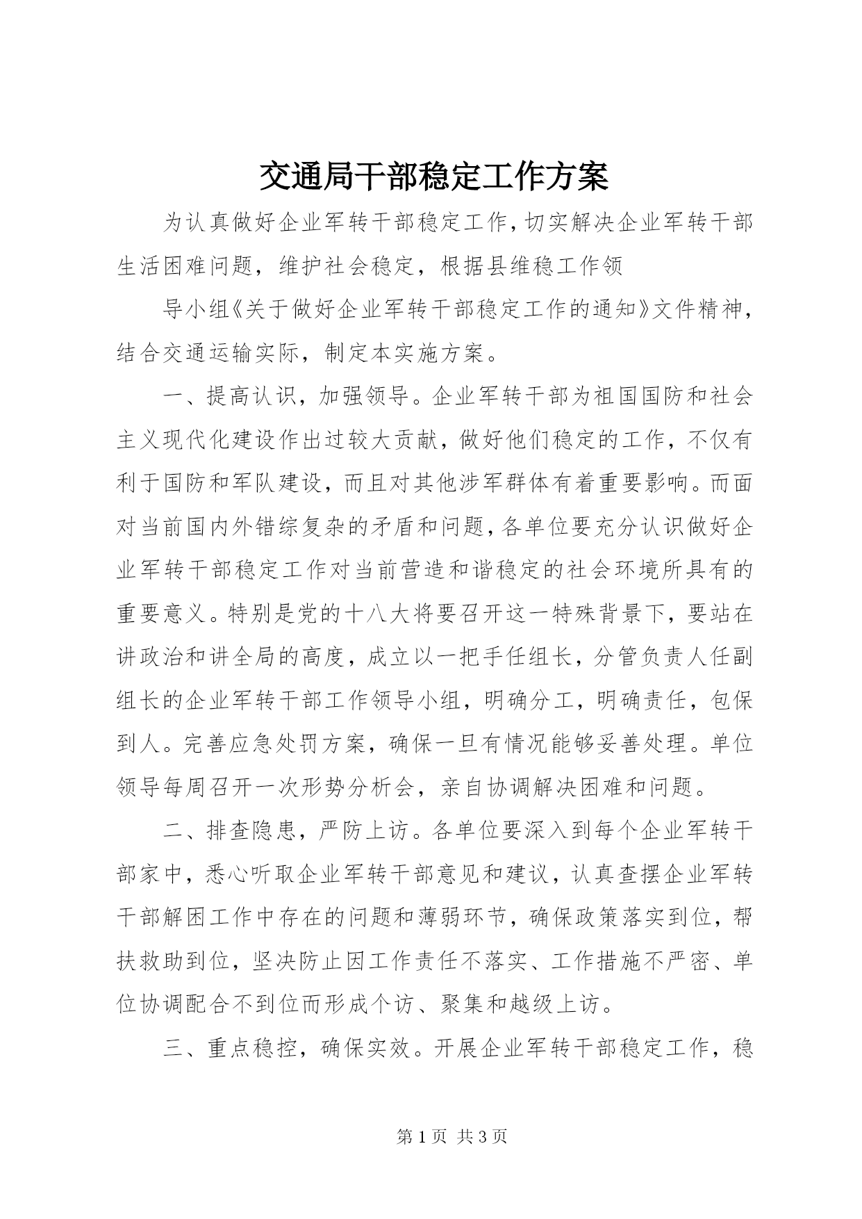 第PAGE\*Arabic\*MERGEFORMAT3页共NUMPAGES\*MERGEFORMAT3页交通局干部稳定工作方案为认真做好企业军转干部稳定工作,切实解决企业军转干部生活困难问题,维护社会稳定,根据县维稳工作领导小组《关于做好企业军转干部稳定工作的通知》文件精神,结合交通运输实际,制定本实施方案。一、提高认识,加强领导。企业军转干部为祖国国防和社会主义现代化建设作出过较大贡献,做好他们稳定的工作,不仅有利于国防和军队建设,而且对其他涉军群体有着重要影响。而面对当前国内外错综复杂的矛