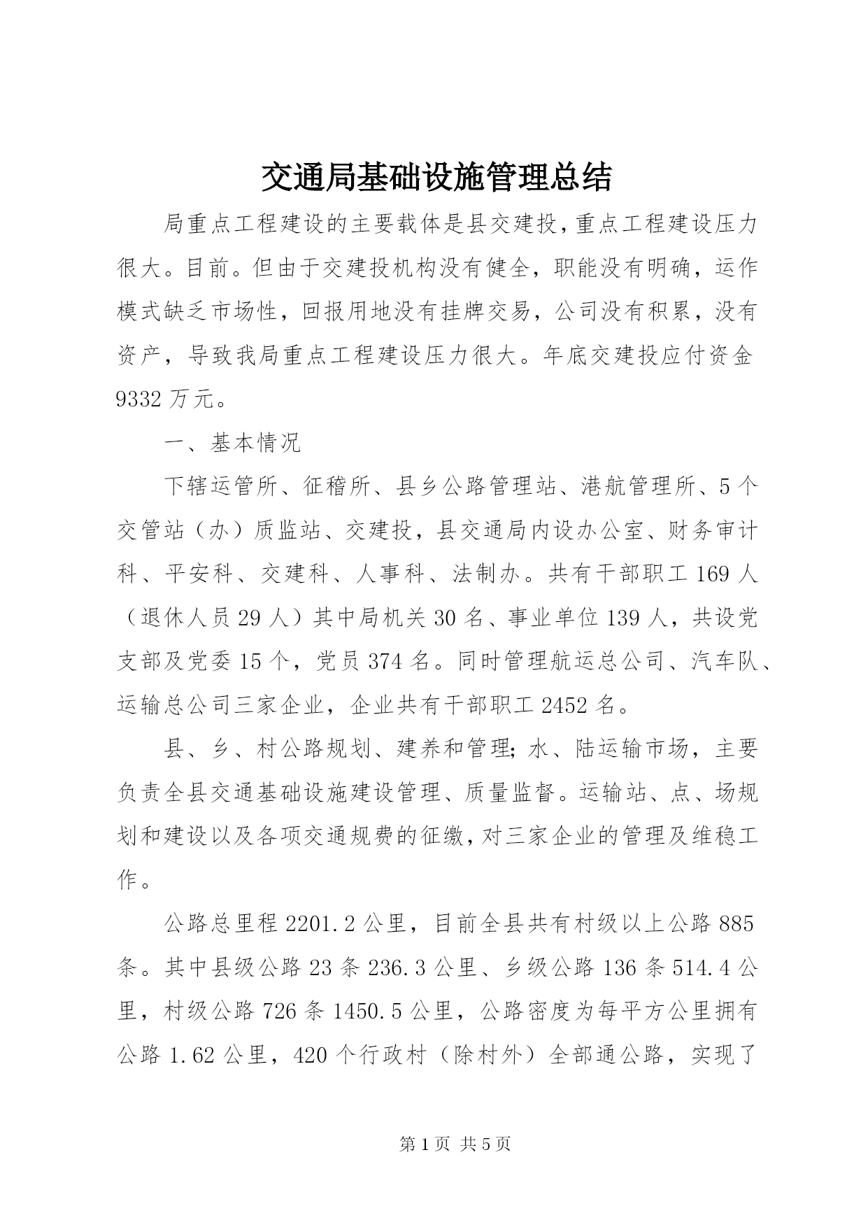 第PAGE\*Arabic\*MERGEFORMAT5页共NUMPAGES\*MERGEFORMAT5页交通局基础设施管理总结局重点工程建设的主要载体是县交建投,重点工程建设压力很大。目前。但由于交建投机构没有健全,职能没有明确,运作模式缺乏市场性,回报用地没有挂牌交易,公司没有积累,没有资产,导致我局重点工程建设压力很大。年底交建投应付资金9332万元。一、基本情况下辖运管所、征稽所、县乡公路管理站、港航管理所、5个交管站(办)质监站、交建投,县交通局内设办公室、财务审计科、平安科、交建科、