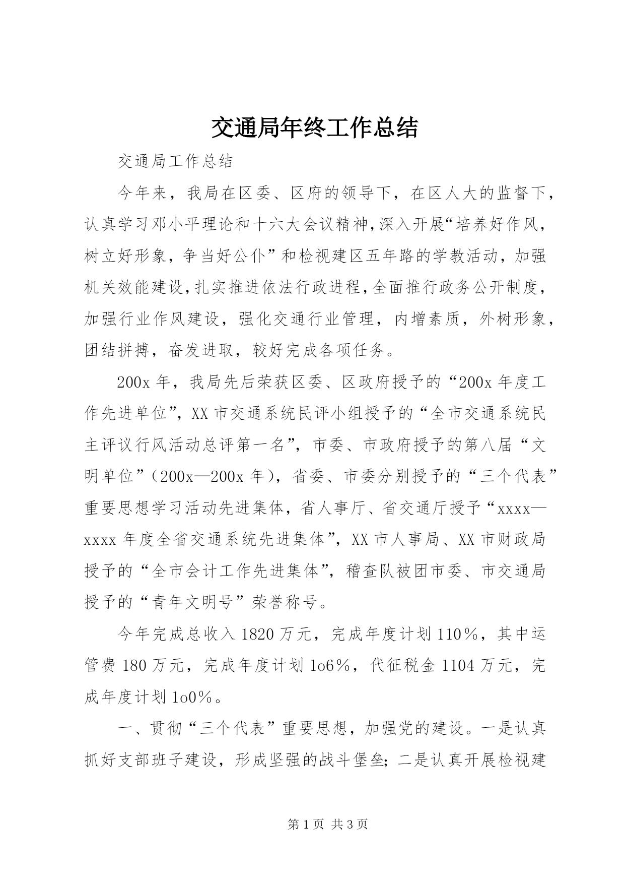 第PAGE\*Arabic\*MERGEFORMAT3页共NUMPAGES\*MERGEFORMAT3页交通局年终工作总结交通局工作总结今年来,我局在区委、区府的领导下,在区人大的监督下,认真学习邓小平理论和十六大会议精神,深入开展“培养好作风,树立好形象,争当好公仆”和检视建区五年路的学教活动,加强机关效能建设,扎实推进依法行政进程,全面推行政务公开制度,加强行业作风建设,强化交通行业管理,内增素质,外树形象,团结拼搏,奋发进取,较好完成各项任务。200x年,我局先后荣获区委、区政府授予的“