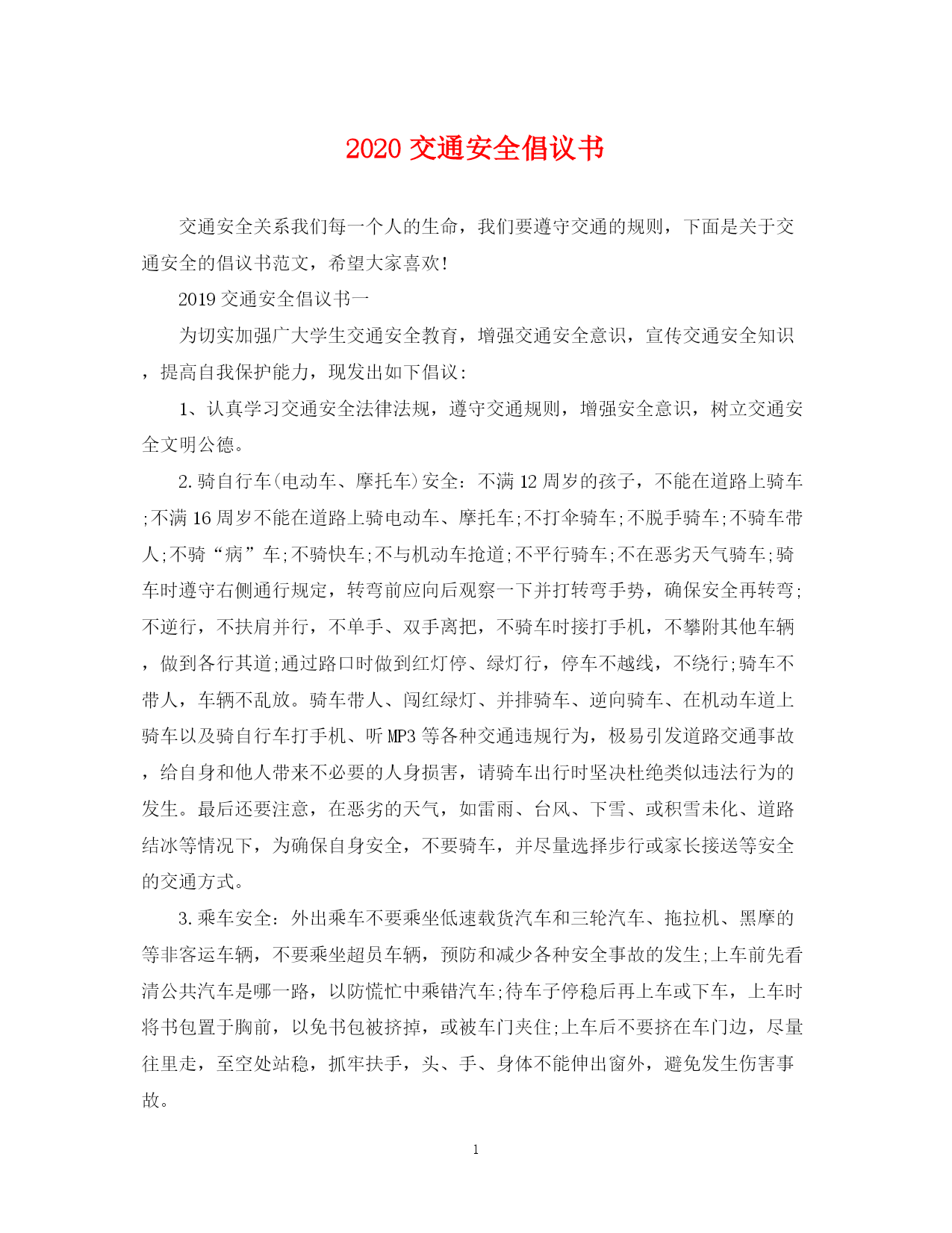 此资料由网络收集而来,如有侵权请告知上传者立即删除。资料共分享,我们负责传递知识。PAGEPAGE32020交通安全倡议书交通安全关系我们每一个人的生命,我们要遵守交通的规则,下面是关于交通安全的倡议书范文,希望大家喜欢!2019交通安全倡议书一为切实加强广大学生交通安全教育,增强交通安全意识,宣传交通安全知识,提高自我保护能力,现发出如下倡议:1、认真学习交通安全法律法规,遵守交通规则,增强安全意识,树立交通安全文明公德。2.骑自行车(电动车、摩托车)安全:不满12周岁的孩子,不能在道路上骑