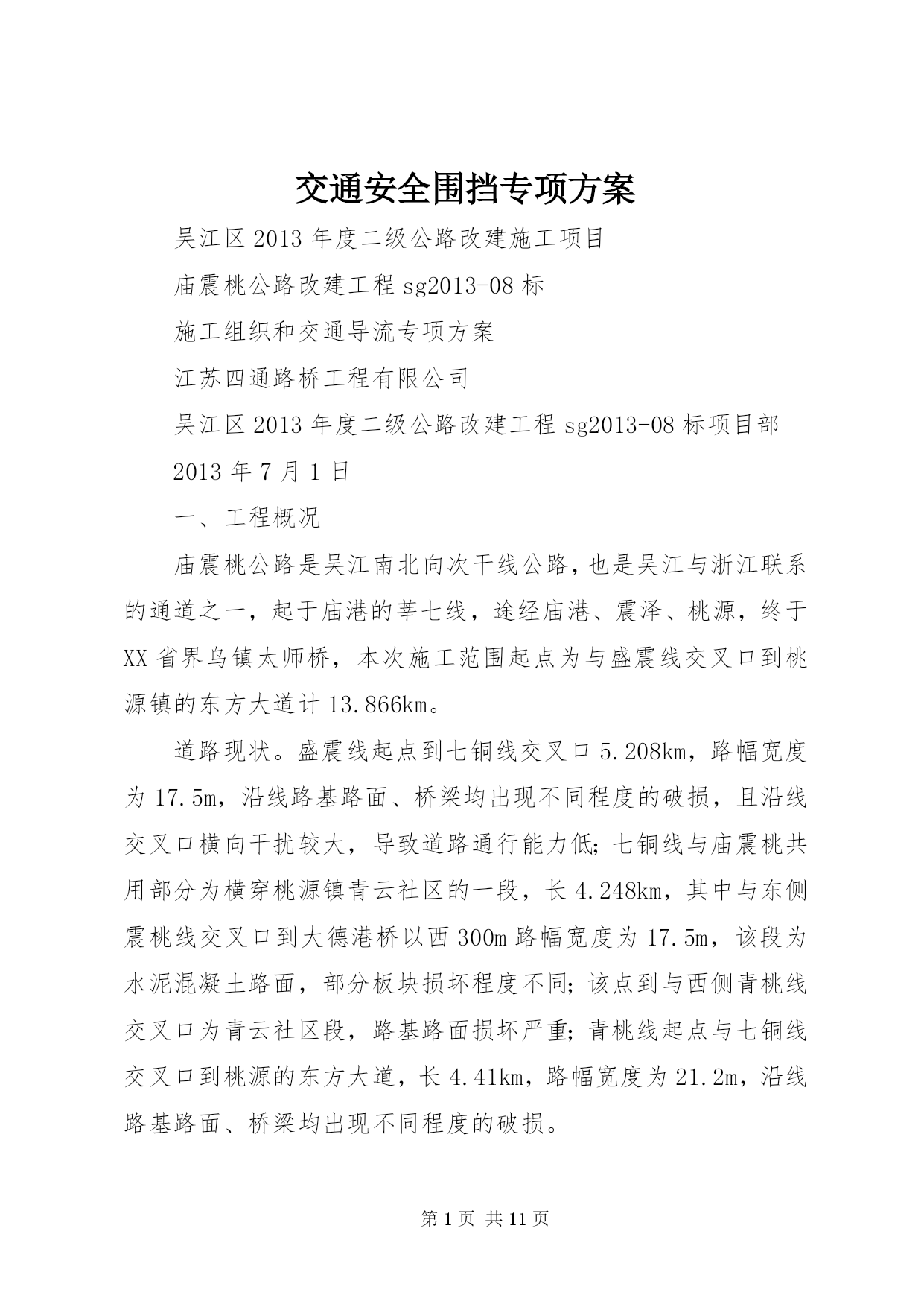 第PAGE\*Arabic\*MERGEFORMAT11页共NUMPAGES\*MERGEFORMAT11页交通安全围挡专项方案吴江区2013年度二级公路改建施工项目庙震桃公路改建工程sg2013-08标施工组织和交通导流专项方案江苏四通路桥工程有限公司吴江区2013年度二级公路改建工程sg2013-08标项目部2013年7月1日一、工程概况庙震桃公路是吴江南北向次干线公路,也是吴江与浙江联系的通道之一,起于庙港的莘七线,途经庙港、震泽、桃源,终于XX省界乌镇太师桥,本次施工范围起点为与盛震线