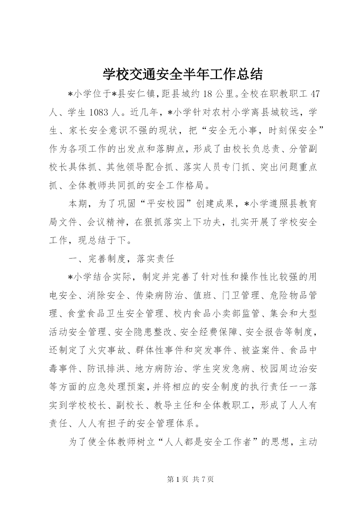 第PAGE\*Arabic\*MERGEFORMAT7页共NUMPAGES\*MERGEFORMAT7页学校交通安全半年工作总结*小学位于*县安仁镇,距县城约18公里。全校在职教职工47人、学生1083人。近几年,*小学针对农村小学离县城较远,学生、家长安全意识不强的现状,把“安全无小事,时刻保安全”作为各项工作的出发点和落脚点,形成了由校长负总责、分管副校长具体抓、其他领导配合抓、落实人员专门抓、突出问题重点抓、全体教师共同抓的安全工作格局。本期,为了巩固“平安校园”创建成果,*小学遵照县教