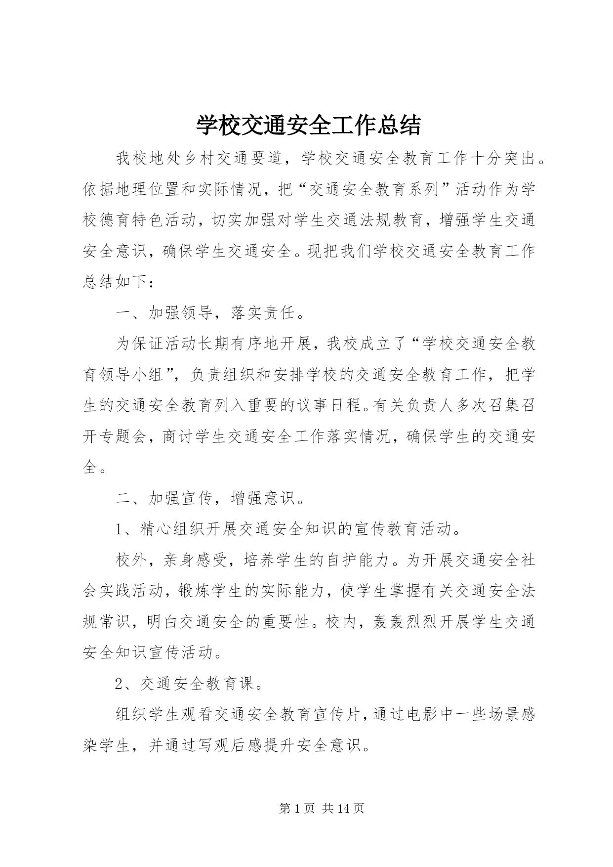第PAGE\*Arabic\*MERGEFORMAT14页共NUMPAGES\*MERGEFORMAT14页学校交通安全工作总结我校地处乡村交通要道,学校交通安全教育工作十分突出。依据地理位置和实际情况,把“交通安全教育系列”活动作为学校德育特色活动,切实加强对学生交通法规教育,增强学生交通安全意识,确保学生交通安全。现把我们学校交通安全教育工作总结如下:一、加强领导,落实责任。为保证活动长期有序地开展,我校成立了“学校交通安全教育领导小组”,负责组织和安排学校的交通安全教育工作,把学生的交通