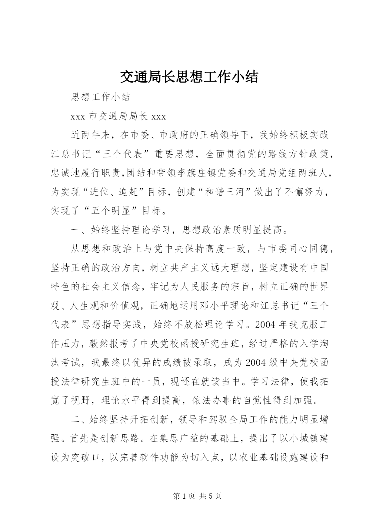 第PAGE\*Arabic\*MERGEFORMAT5页共NUMPAGES\*MERGEFORMAT5页交通局长思想工作小结思想工作小结xxx市交通局局长xxx近两年来,在市委、市政府的正确领导下,我始终积极实践江总书记“三个代表”重要思想,全面贯彻党的路线方针政策,忠诚地履行职责,团结和带领李旗庄镇党委和交通局党组两班人,为实现“进位、追赶”目标,创建“和谐三河”做出了不懈努力,实现了“五个明显”目标。一、始终坚持理论学习,思想政治素质明显提高。从思想和政治上与党中央保持高度一致,与市委同心