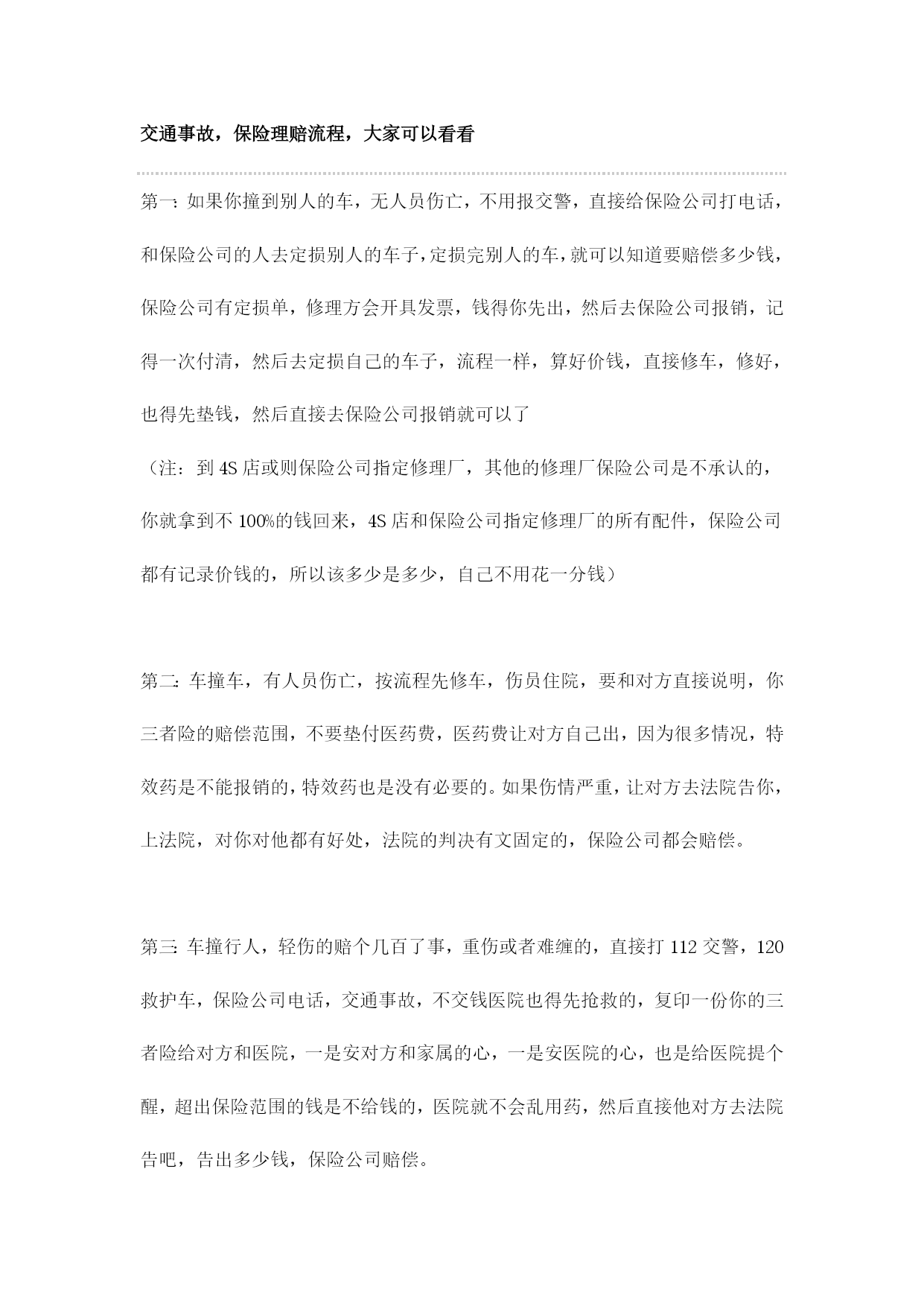 交通事故,保险理赔流程,大家可以看看第一:如果你撞到别人的车,无人员伤亡,不用报交警,直接给保险公司打电话,和保险公司的人去定损别人的车子,定损完别人的车,就可以知道要赔偿多少钱,保险公司有定损单,修理方会开具发票,钱得你先出,然后去保险公司报销,记得一次付清,然后去定损自己的车子,流程一样,算好价钱,直接修车,修好,也得先垫钱,然后直接去保险公司报销就可以了(注:到4S店或则保险公司指定修理厂,其他的修理厂保险公司是不承认的,你就拿到不100%的钱回来,4S店和保险公司指定修理厂的所有配件,保险公司都有