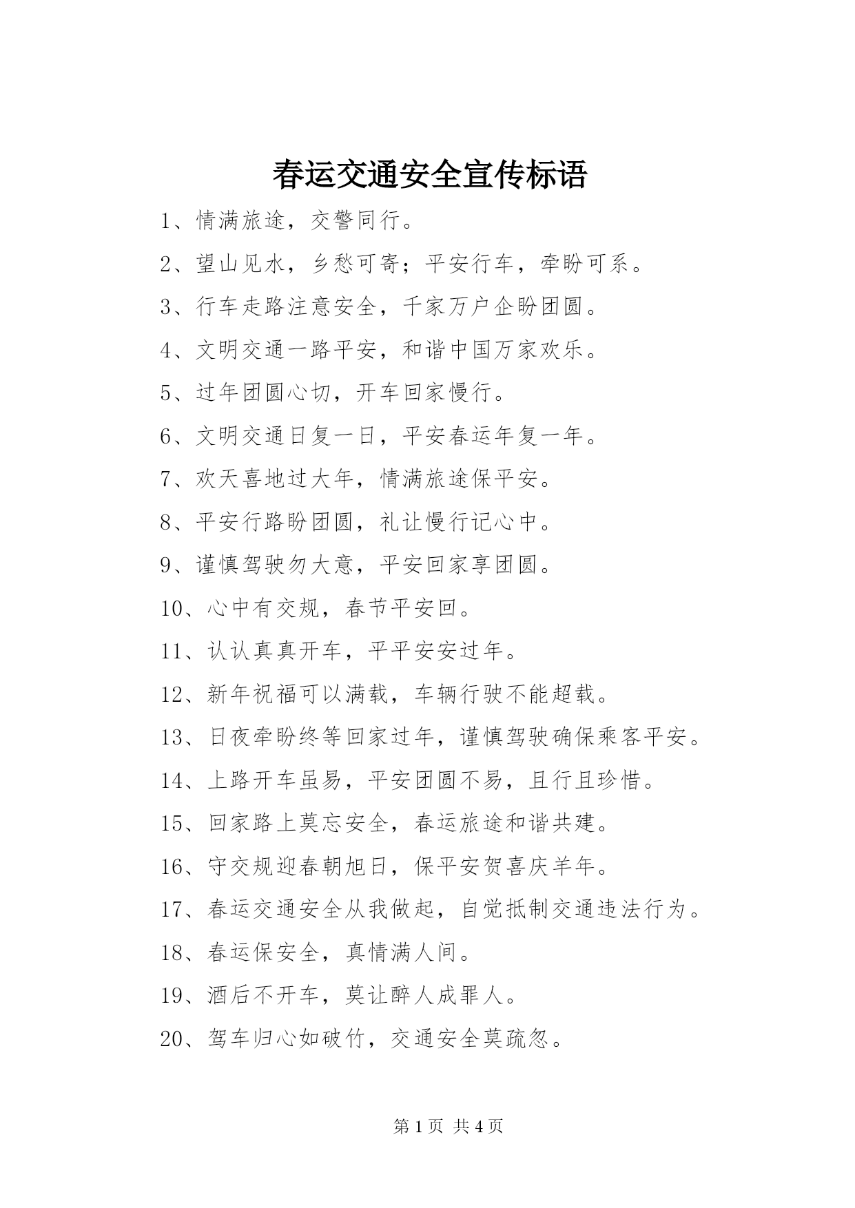 第PAGE\*Arabic\*MERGEFORMAT4页共NUMPAGES\*MERGEFORMAT4页春运交通安全宣传标语1、情满旅途,交警同行。2、望山见水,乡愁可寄;平安行车,牵盼可系。3、行车走路注意安全,千家万户企盼团圆。4、文明交通一路平安,和谐中国万家欢乐。5、过年团圆心切,开车回家慢行。6、文明交通日复一日,平安春运年复一年。7、欢天喜地过大年,情满旅途保平安。8、平安行路盼团圆,礼让慢行记心中。9、谨慎驾驶勿大意,平安回家享团圆。10、心中有交规,春节平安回。11、认认真真开