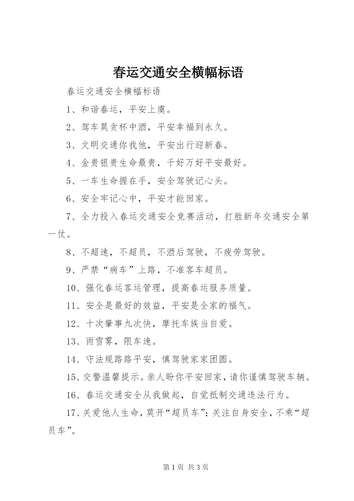 第PAGE\*Arabic\*MERGEFORMAT3页共NUMPAGES\*MERGEFORMAT3页春运交通安全横幅标语春运交通安全横幅标语1、和谐春运,平安上虞。2、驾车莫贪杯中酒,平安幸福到永久。3、文明交通你我他,平安出行迎新春。4、金贵银贵生命最贵,千好万好平安最好。5、一车生命握在手,安全驾驶记心头。6、安全牢记心中,平安才能回家。7、全力投入春运交通安全竞赛活动,打胜新年交通安全第一仗。8、不超速,不超员,不酒后驾驶,不疲劳驾驶。9、严禁“病车”上路,不准客车超员。10、强化春