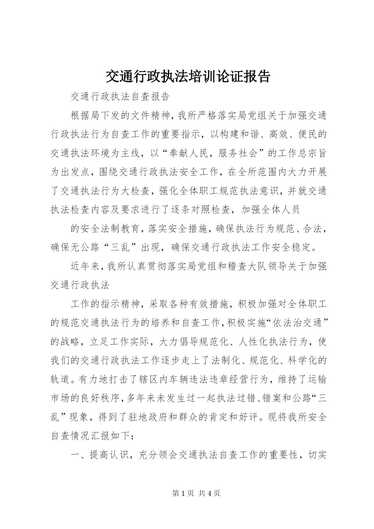 第PAGE\*Arabic\*MERGEFORMAT4页共NUMPAGES\*MERGEFORMAT4页交通行政执法培训论证报告交通行政执法自查报告根据局下发的文件精神,我所严格落实局党组关于加强交通行政执法行为自查工作的重要指示,以构建和谐、高效、便民的交通执法环境为主线,以“奉献人民,服务社会”的工作总宗旨为出发点,围绕交通行政执法安全工作,在全所范围内大力开展了交通执法行为大检查,强化全体职工规范执法意识,并就交通执法检查内容及要求进行了逐条对照检查,加强全体人员的安全法制教育,落实安全