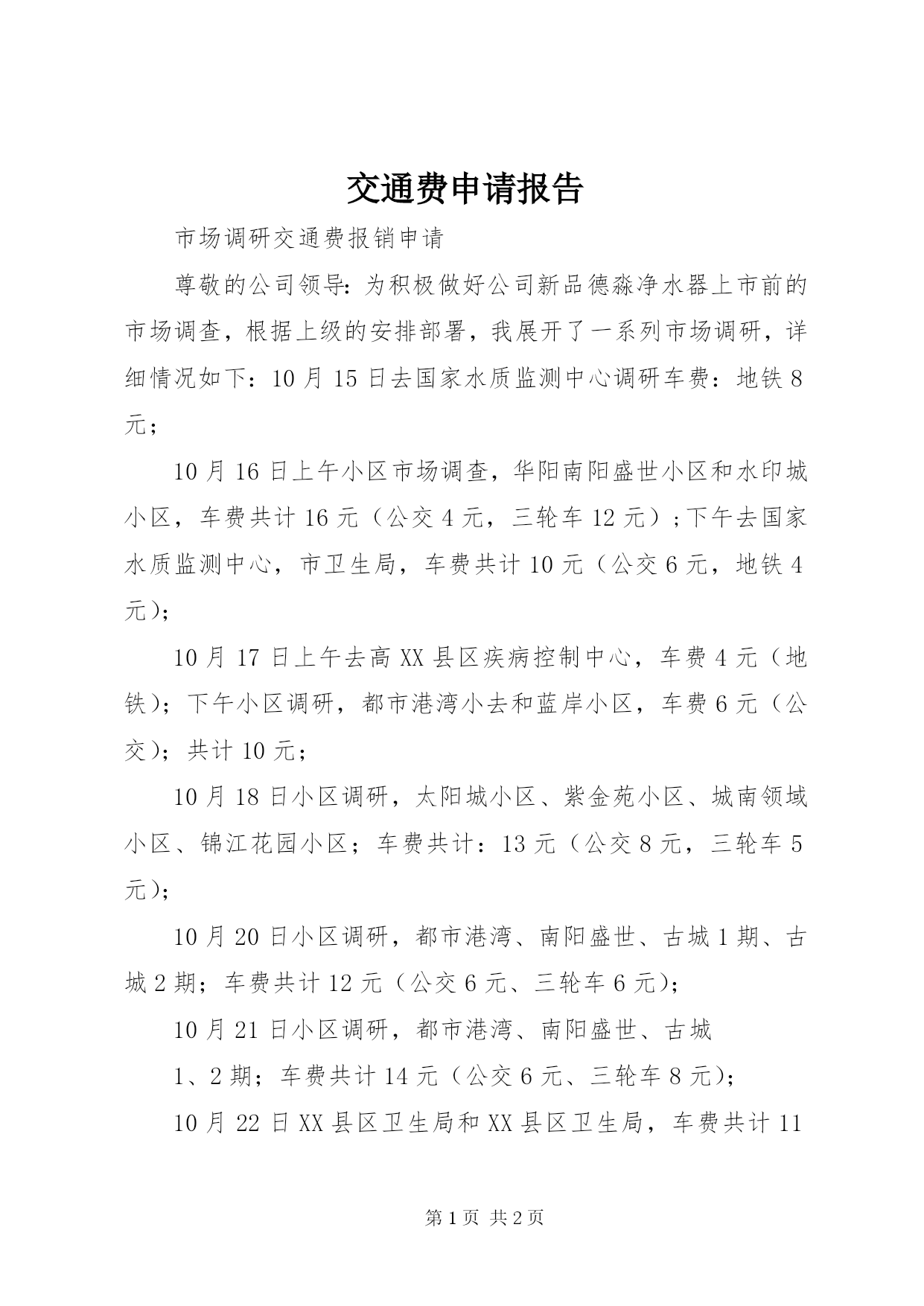 第PAGE\*Arabic\*MERGEFORMAT2页共NUMPAGES\*MERGEFORMAT2页交通费申请报告市场调研交通费报销申请尊敬的公司领导:为积极做好公司新品德淼净水器上市前的市场调查,根据上级的安排部署,我展开了一系列市场调研,详细情况如下:10月15日去国家水质监测中心调研车费:地铁8元;10月16日上午小区市场调查,华阳南阳盛世小区和水印城小区,车费共计16元(公交4元,三轮车12元);下午去国家水质监测中心,市卫生局,车费共计10元(公交6元,地铁4元);10月17日上