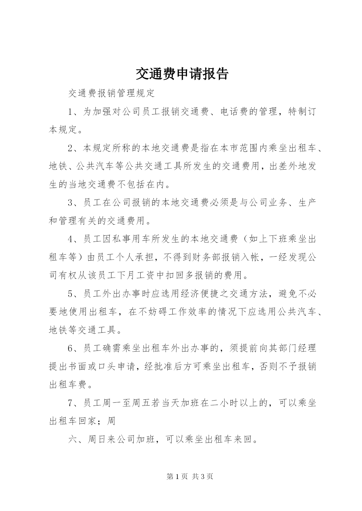 第PAGE\*Arabic\*MERGEFORMAT3页共NUMPAGES\*MERGEFORMAT3页交通费申请报告交通费报销管理规定1、为加强对公司员工报销交通费、电话费的管理,特制订本规定。2、本规定所称的本地交通费是指在本市范围内乘坐出租车、地铁、公共汽车等公共交通工具所发生的交通费用,出差外地发生的当地交通费不包括在内。3、员工在公司报销的本地交通费必须是与公司业务、生产和管理有关的交通费用。4、员工因私事用车所发生的本地交通费(如上下班乘坐出租车等)由员工个人承担,不得到财务部报销