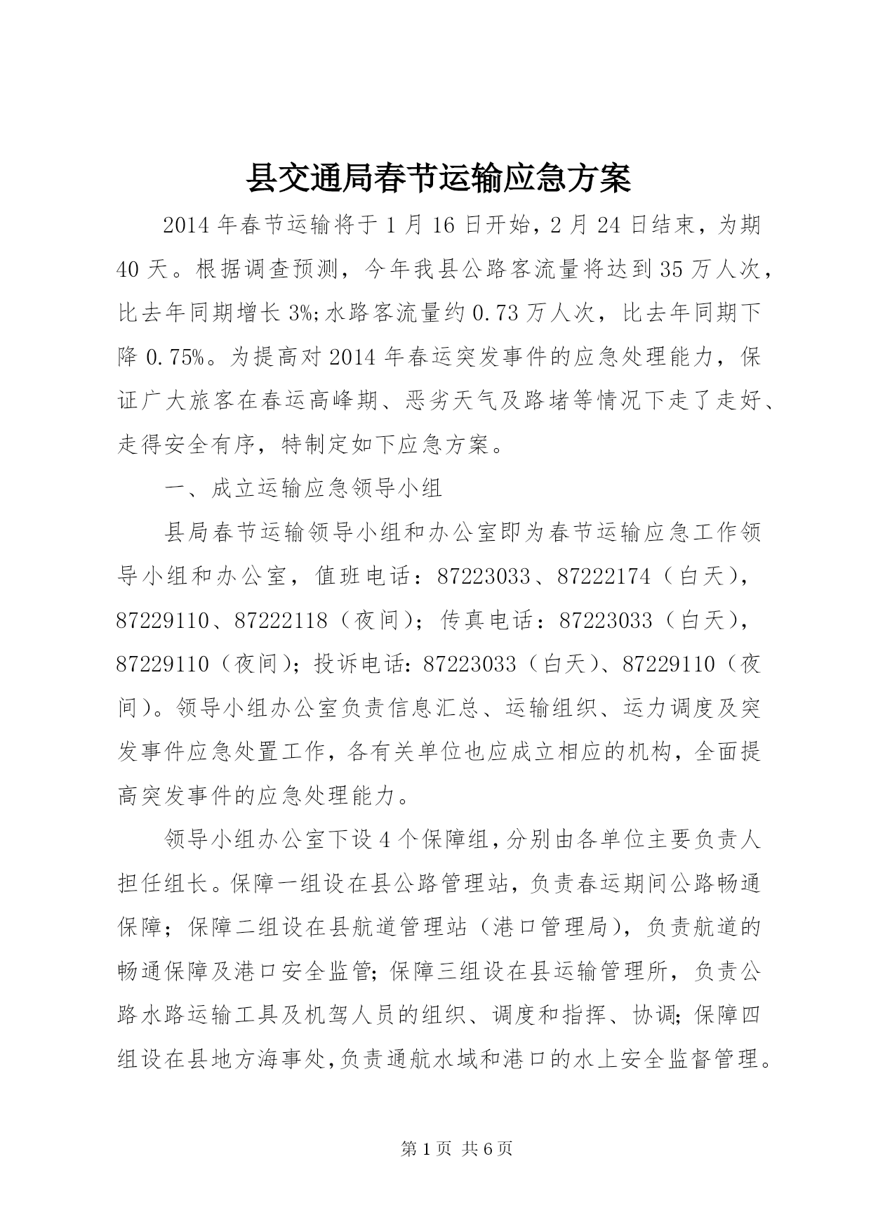 第PAGE\*Arabic\*MERGEFORMAT6页共NUMPAGES\*MERGEFORMAT6页县交通局春节运输应急方案2014年春节运输将于1月16日开始,2月24日结束,为期40天。根据调查预测,今年我县公路客流量将达到35万人次,比去年同期增长3%;水路客流量约0.73万人次,比去年同期下降0.75%。为提高对2014年春运突发事件的应急处理能力,保证广大旅客在春运高峰期、恶劣天气及路堵等情况下走了走好、走得安全有序,特制定如下应急方案。一、成立运输应急领导小组县局春节运输领导小