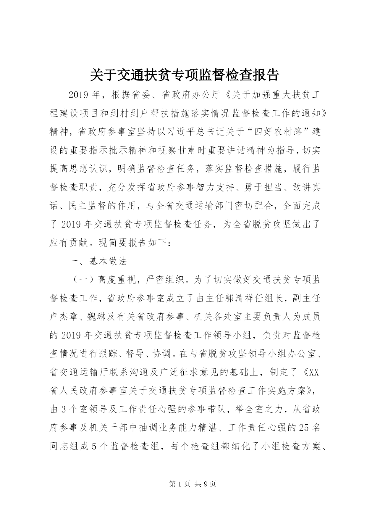 第PAGE\*Arabic\*MERGEFORMAT9页共NUMPAGES\*MERGEFORMAT9页关于交通扶贫专项监督检查报告2019年,根据省委、省政府办公厅《关于加强重大扶贫工程建设项目和到村到户帮扶措施落实情况监督检查工作的通知》精神,省政府参事室坚持以习近平总书记关于“四好农村路”建设的重要指示批示精神和视察甘肃时重要讲话精神为指导,切实提高思想认识,明确监督检查任务,落实监督检查措施,履行监督检查职责,充分发挥省政府参事智力支持、勇于担当、敢讲真话、民主监督的作用,与全省交通运