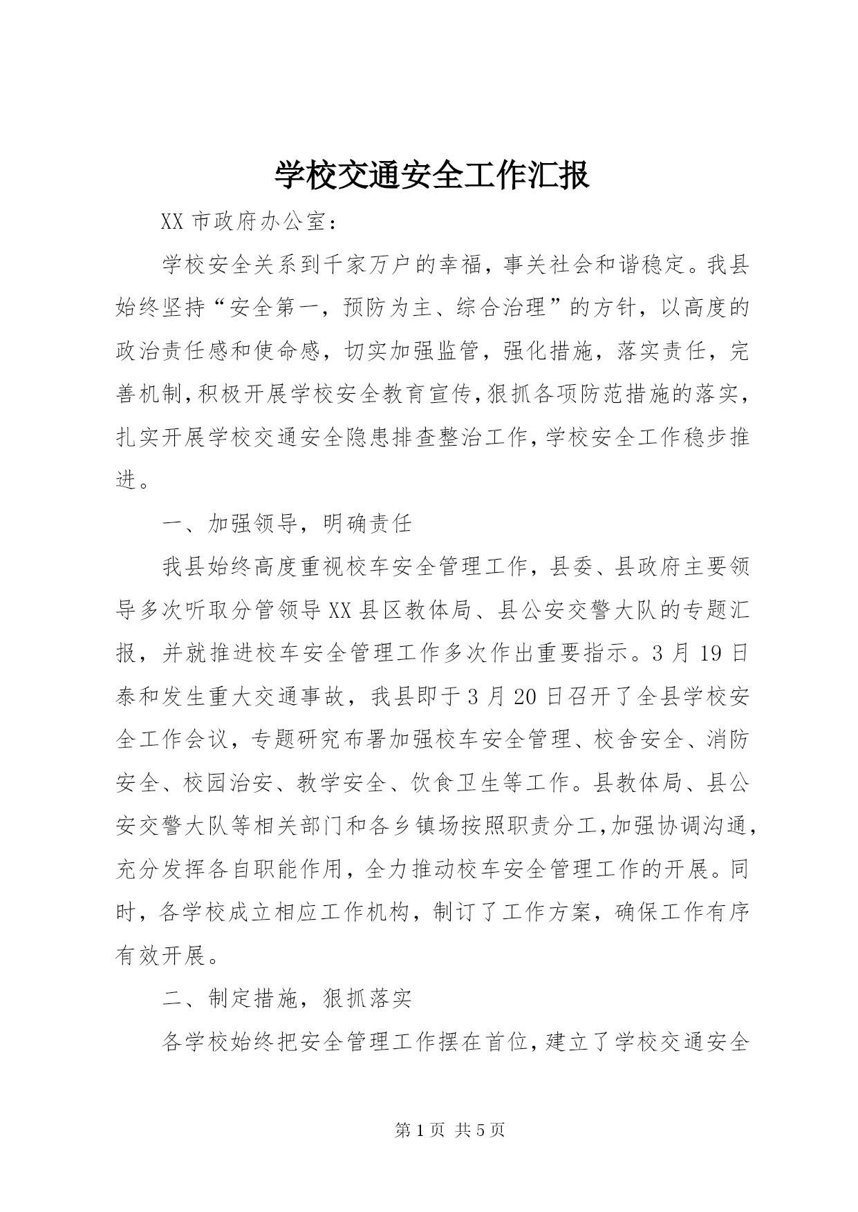 第PAGE\*Arabic\*MERGEFORMAT5页共NUMPAGES\*MERGEFORMAT5页学校交通安全工作汇报XX市政府办公室:学校安全关系到千家万户的幸福,事关社会和谐稳定。我县始终坚持“安全第一,预防为主、综合治理”的方针,以高度的政治责任感和使命感,切实加强监管,强化措施,落实责任,完善机制,积极开展学校安全教育宣传,狠抓各项防范措施的落实,扎实开展学校交通安全隐患排查整治工作,学校安全工作稳步推进。一、加强领导,明确责任我县始终高度重视校车安全管理工作,县委、县政府主要领