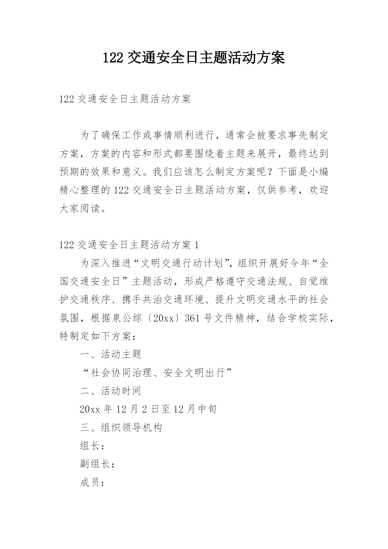 122交通安全日主题活动方案122交通安全日主题活动方案为了确保工作或事情顺利进行,通常会被要求事先制定方案,方案的内容和形式都要围绕着主题来展开,最终达到预期的效果和意义。我们应该怎么制定方案呢?下面是小编精心整理的122交通安全日主题活动方案,仅供参考,欢迎大家阅读。122交通安全日主题活动方案1为深入推进“文明交通行动计划”,组织开展好今年“全国交通安全日”主题活动,形成严格遵守交通法规、自觉维护交通秩序、携手共治交通环境、提升文明交通水平的社会氛围,根据泉公综〔20xx〕361号文件精神,结合学校