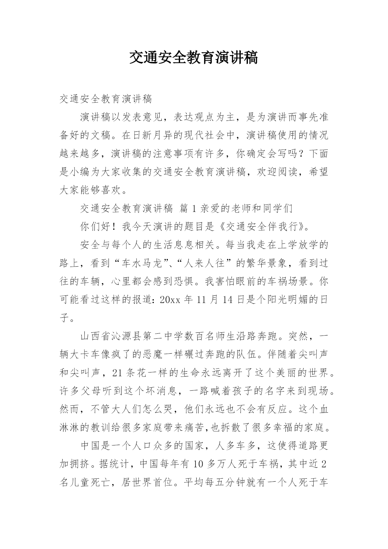 交通安全教育演讲稿交通安全教育演讲稿演讲稿以发表意见,表达观点为主,是为演讲而事先准备好的文稿。在日新月异的现代社会中,演讲稿使用的情况越来越多,演讲稿的注意事项有许多,你确定会写吗?下面是小编为大家收集的交通安全教育演讲稿,欢迎阅读,希望大家能够喜欢。交通安全教育演讲稿篇1亲爱的老师和同学们你们好!我今天演讲的题目是《交通安全伴我行》。安全与每个人的生活息息相关。每当我走在上学放学的路上,看到“车水马龙”、“人来人往”的繁华景象,看到过往的车辆,心里都会感到恐惧。我害怕眼前的车祸场景。你可能看过这样的报