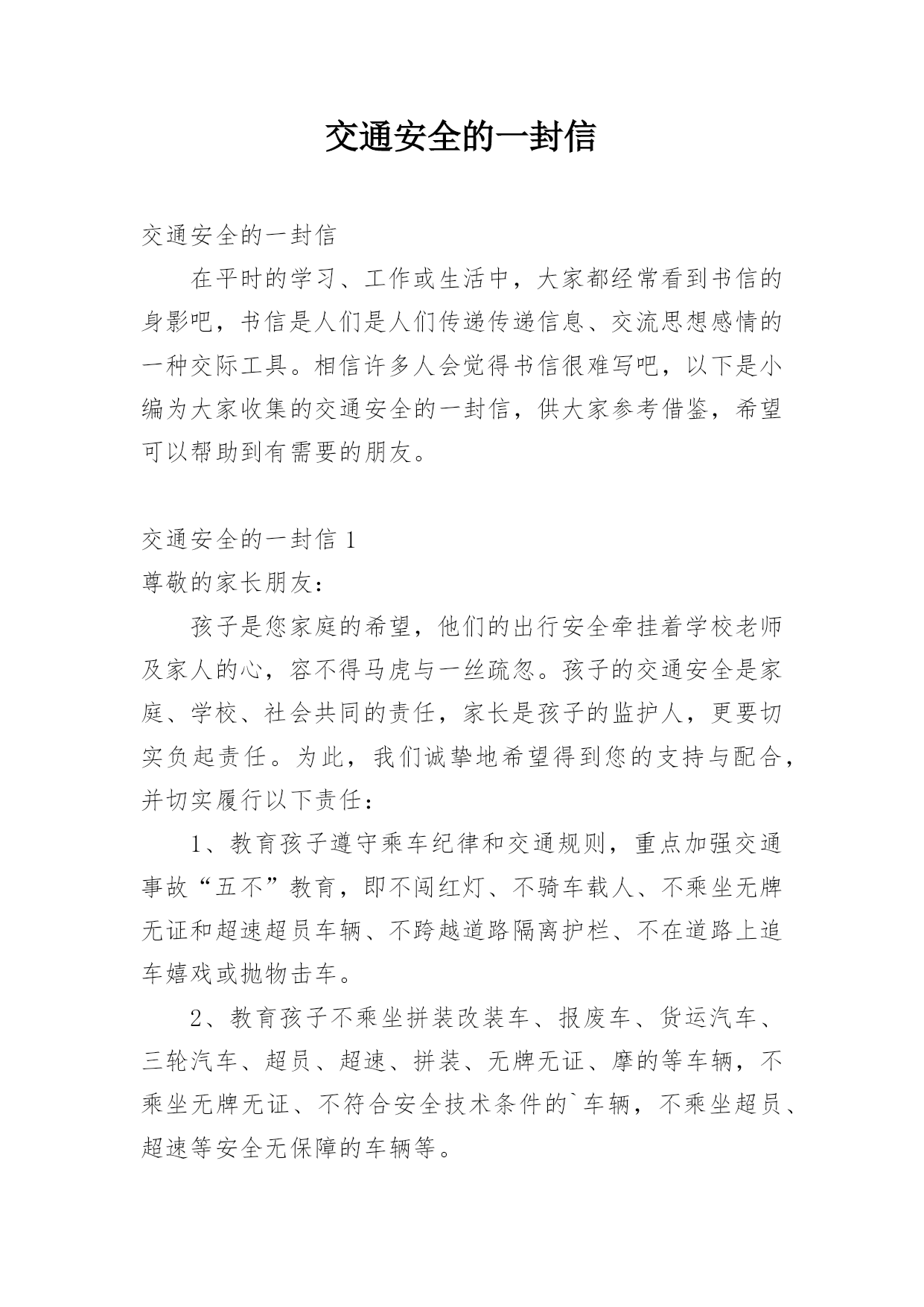 交通安全的一封信交通安全的一封信在平时的学习、工作或生活中,大家都经常看到书信的身影吧,书信是人们是人们传递传递信息、交流思想感情的一种交际工具。相信许多人会觉得书信很难写吧,以下是小编为大家收集的交通安全的一封信,供大家参考借鉴,希望可以帮助到有需要的朋友。交通安全的一封信1尊敬的家长朋友:孩子是您家庭的希望,他们的出行安全牵挂着学校老师及家人的心,容不得马虎与一丝疏忽。孩子的交通安全是家庭、学校、社会共同的责任,家长是孩子的监护人,更要切实负起责任。为此,我们诚挚地希望得到您的支持与配合,并切实履行以