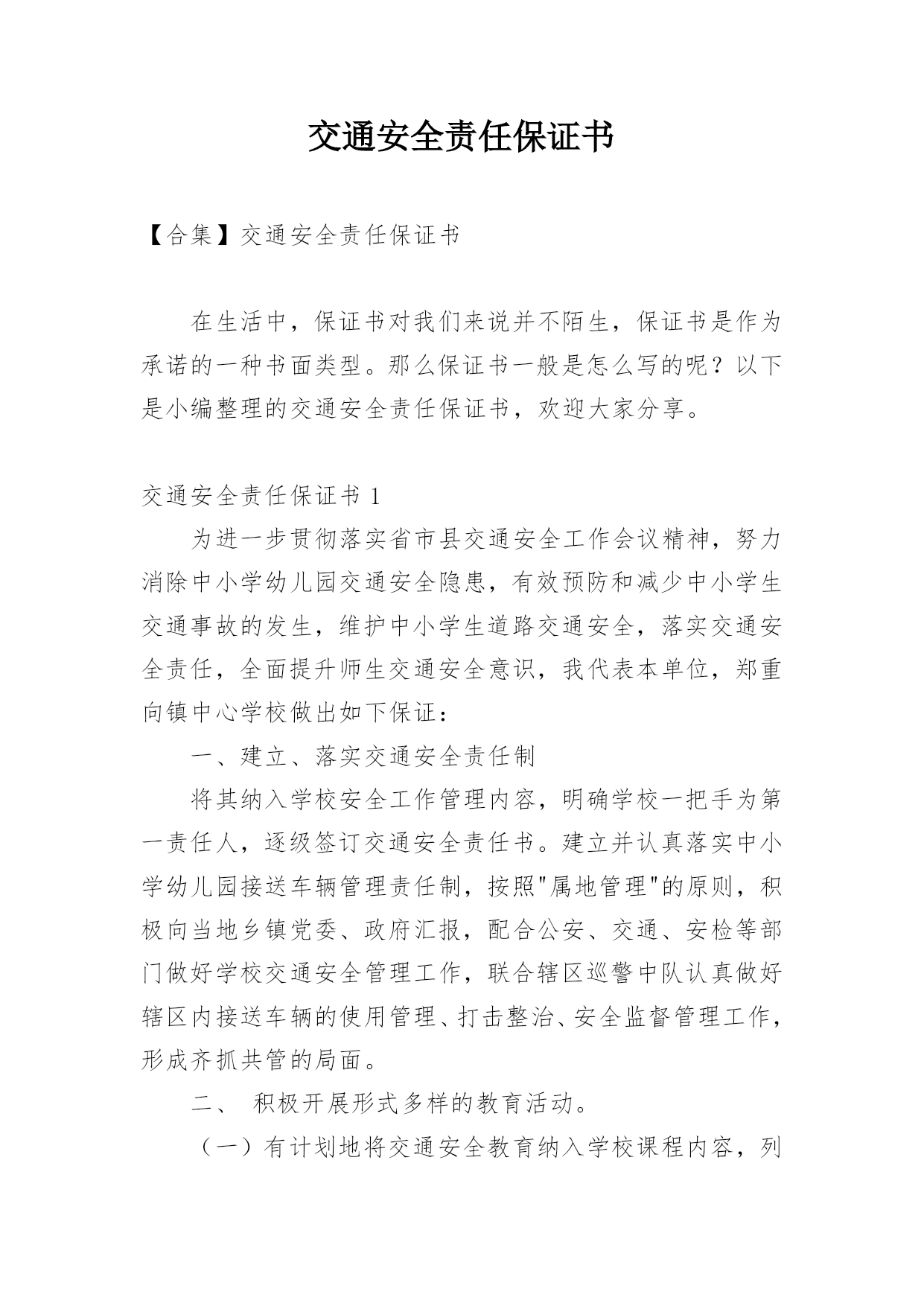 交通安全责任保证书【合集】交通安全责任保证书在生活中,保证书对我们来说并不陌生,保证书是作为承诺的一种书面类型。那么保证书一般是怎么写的呢?以下是小编整理的交通安全责任保证书,欢迎大家分享。交通安全责任保证书1为进一步贯彻落实省市县交通安全工作会议精神,努力消除中小学幼儿园交通安全隐患,有效预防和减少中小学生交通事故的发生,维护中小学生道路交通安全,落实交通安全责任,全面提升师生交通安全意识,我代表本单位,郑重向镇中心学校做出如下保证:一、建立、落实交通安全责任制将其纳入学校安全工作管理内容,明确学校一把