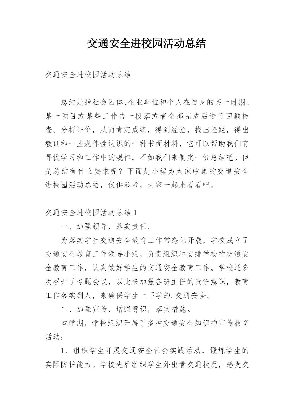 交通安全进校园活动总结交通安全进校园活动总结总结是指社会团体、企业单位和个人在自身的某一时期、某一项目或某些工作告一段落或者全部完成后进行回顾检查、分析评价,从而肯定成绩,得到经验,找出差距,得出教训和一些规律性认识的一种书面材料,它可以帮助我们有寻找学习和工作中的规律,不如我们来制定一份总结吧。但是总结有什么要求呢?下面是小编为大家收集的交通安全进校园活动总结,仅供参考,大家一起来看看吧。交通安全进校园活动总结1一、加强领导,落实责任。为落实学生交通安全教育工作常态化开展,学校成立了交通安全教育工作领导