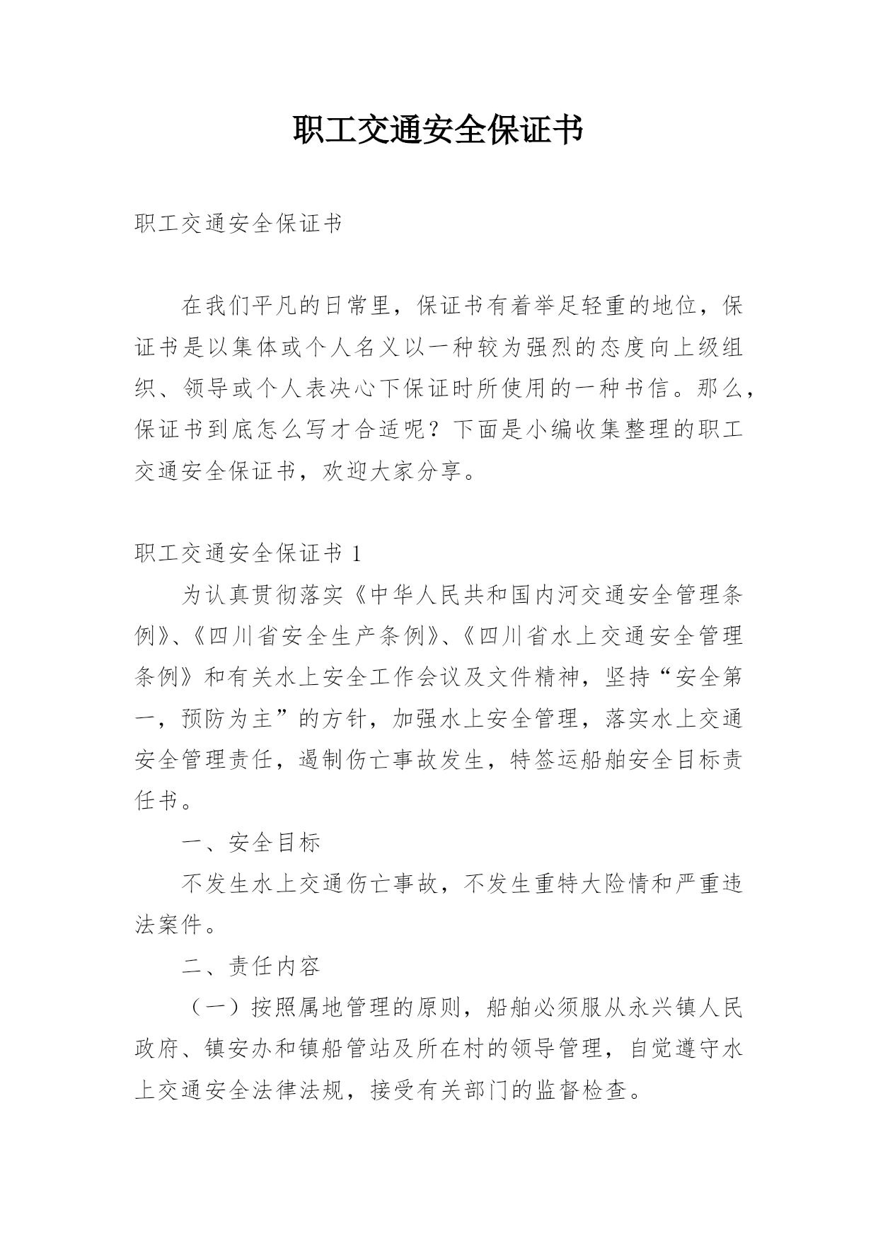 职工交通安全保证书职工交通安全保证书在我们平凡的日常里,保证书有着举足轻重的地位,保证书是以集体或个人名义以一种较为强烈的态度向上级组织、领导或个人表决心下保证时所使用的一种书信。那么,保证书到底怎么写才合适呢?下面是小编收集整理的职工交通安全保证书,欢迎大家分享。职工交通安全保证书1为认真贯彻落实《中华人民共和国内河交通安全管理条例》、《四川省安全生产条例》、《四川省水上交通安全管理条例》和有关水上安全工作会议及文件精神,坚持“安全第一,预防为主”的方针,加强水上安全管理,落实水上交通安全管理责任,遏制