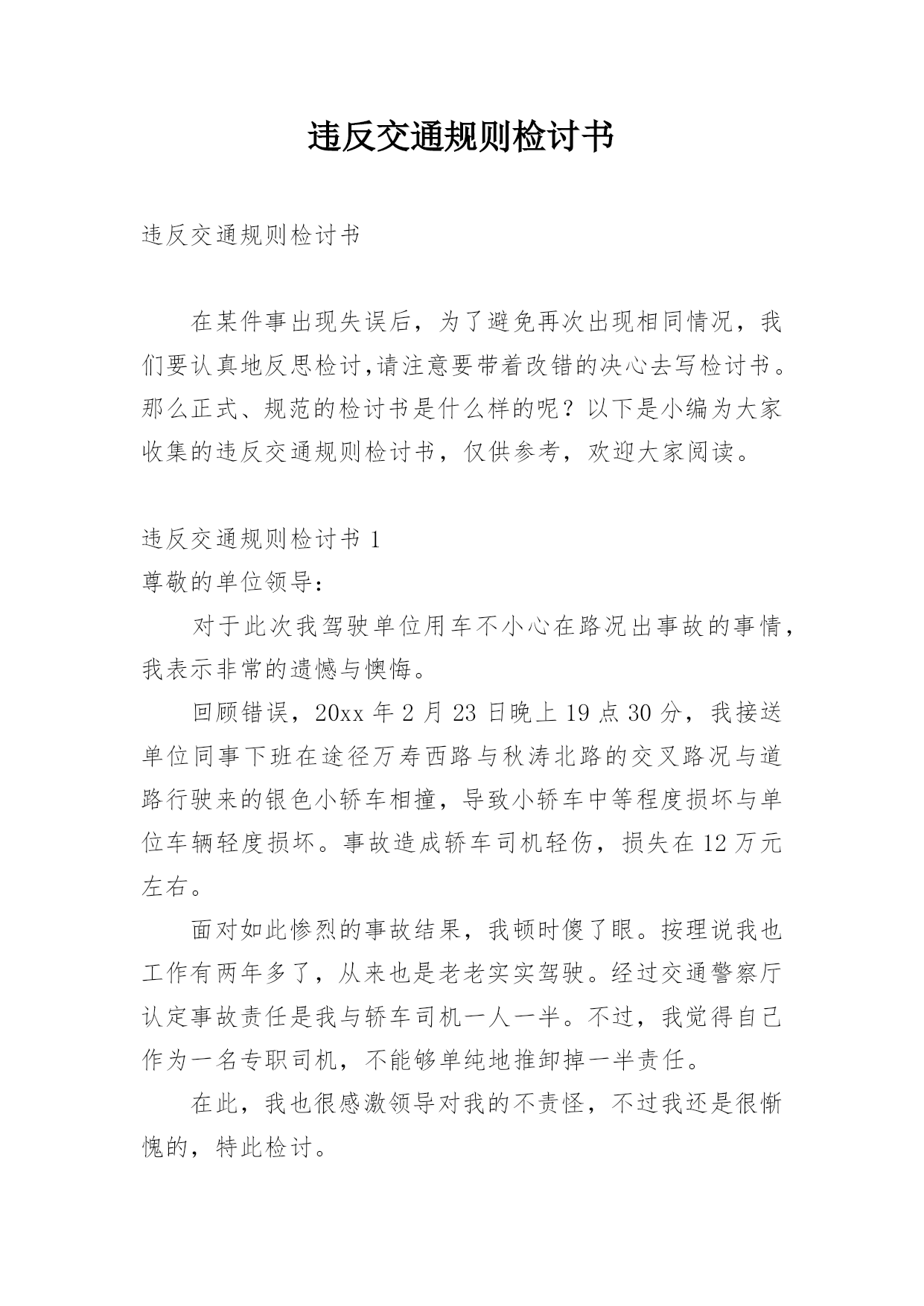 违反交通规则检讨书违反交通规则检讨书在某件事出现失误后,为了避免再次出现相同情况,我们要认真地反思检讨,请注意要带着改错的决心去写检讨书。那么正式、规范的检讨书是什么样的呢?以下是小编为大家收集的违反交通规则检讨书,仅供参考,欢迎大家阅读。违反交通规则检讨书1尊敬的单位领导:对于此次我驾驶单位用车不小心在路况出事故的事情,我表示非常的遗憾与懊悔。回顾错误,20xx年2月23日晚上19点30分,我接送单位同事下班在途径万寿西路与秋涛北路的交叉路况与道路行驶来的银色小轿车相撞,导致小轿车中等程度损坏与单位车辆