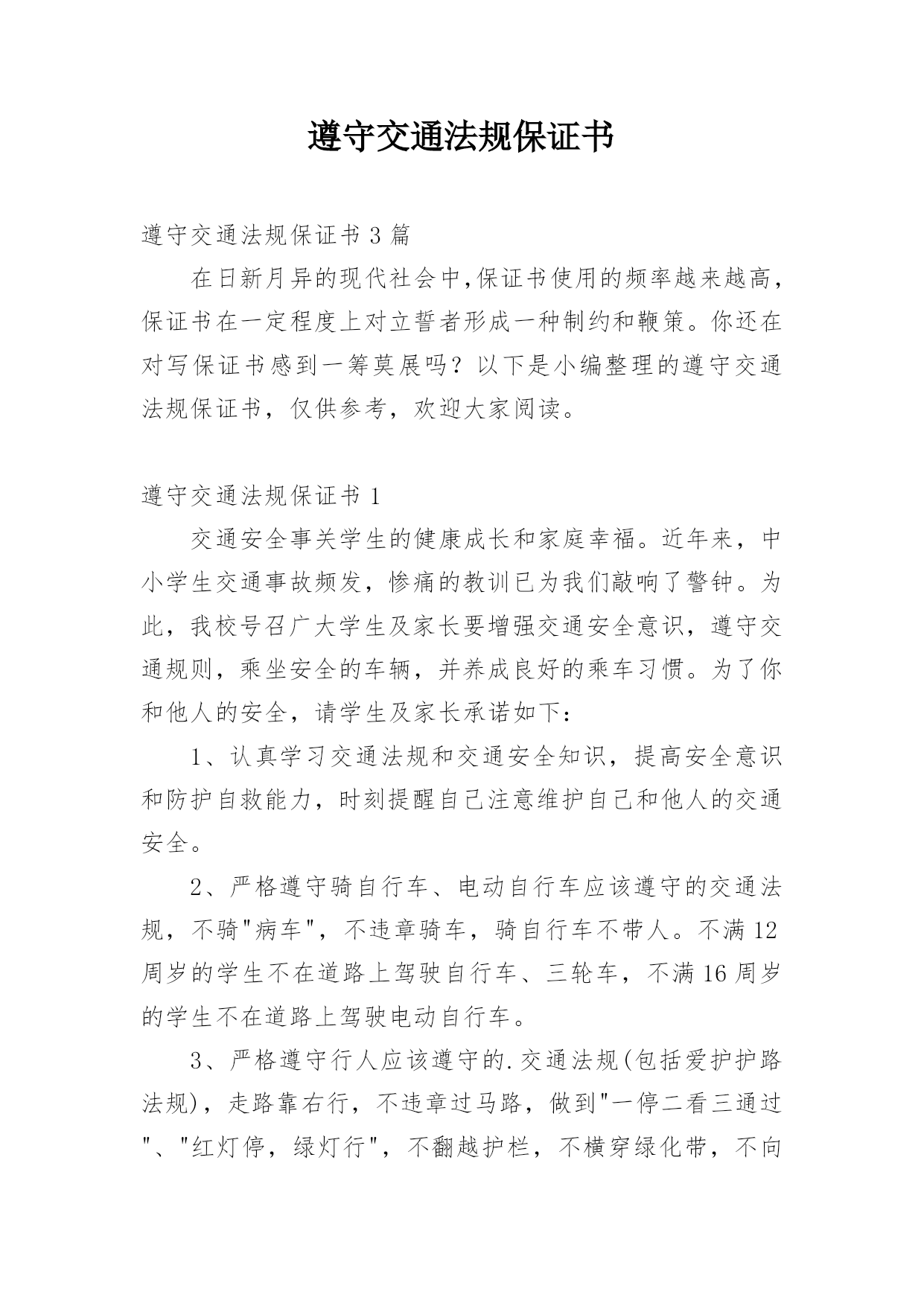 遵守交通法规保证书遵守交通法规保证书3篇在日新月异的现代社会中,保证书使用的频率越来越高,保证书在一定程度上对立誓者形成一种制约和鞭策。你还在对写保证书感到一筹莫展吗?以下是小编整理的遵守交通法规保证书,仅供参考,欢迎大家阅读。遵守交通法规保证书1交通安全事关学生的健康成长和家庭幸福。近年来,中小学生交通事故频发,惨痛的教训已为我们敲响了警钟。为此,我校号召广大学生及家长要增强交通安全意识,遵守交通规则,乘坐安全的车辆,并养成良好的乘车习惯。为了你和他人的安全,请学生及家长承诺如下:1、认真学习交通法规和