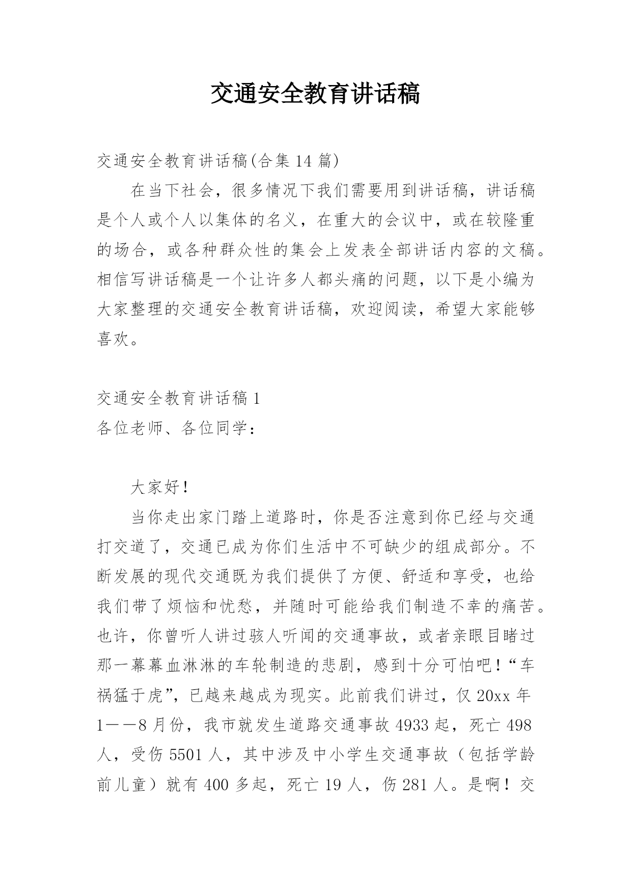 交通安全教育讲话稿交通安全教育讲话稿(合集14篇)在当下社会,很多情况下我们需要用到讲话稿,讲话稿是个人或个人以集体的名义,在重大的会议中,或在较隆重的场合,或各种群众性的集会上发表全部讲话内容的文稿。相信写讲话稿是一个让许多人都头痛的问题,以下是小编为大家整理的交通安全教育讲话稿,欢迎阅读,希望大家能够喜欢。交通安全教育讲话稿1各位老师、各位同学:大家好!当你走出家门踏上道路时,你是否注意到你已经与交通打交道了,交通已成为你们生活中不可缺少的组成部分。不断发展的现代交通既为我们提供了方便、舒适和享受,也