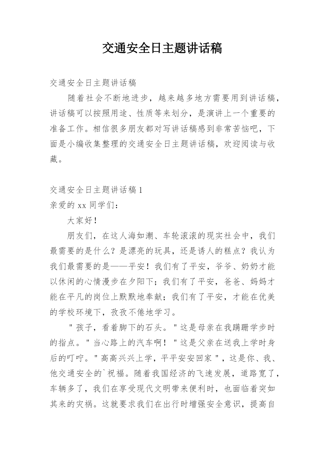 交通安全日主题讲话稿交通安全日主题讲话稿随着社会不断地进步,越来越多地方需要用到讲话稿,讲话稿可以按照用途、性质等来划分,是演讲上一个重要的准备工作。相信很多朋友都对写讲话稿感到非常苦恼吧,下面是小编收集整理的交通安全日主题讲话稿,欢迎阅读与收藏。交通安全日主题讲话稿1亲爱的xx同学们:大家好!朋友们,在这人海如潮、车轮滚滚的现实社会中,我们最需要的是什么?是漂亮的玩具,还是诱人的糕点?我认为我们最需要的是——平安!我们有了平安,爷爷、奶奶才能以休闲的心情漫步在夕阳下;我们有了平安,爸爸、妈妈才能在平凡的