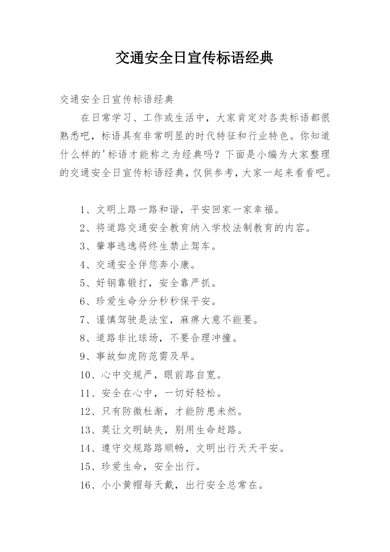 交通安全日宣传标语经典交通安全日宣传标语经典在日常学习、工作或生活中,大家肯定对各类标语都很熟悉吧,标语具有非常明显的时代特征和行业特色。你知道什么样的'标语才能称之为经典吗?下面是小编为大家整理的交通安全日宣传标语经典,仅供参考,大家一起来看看吧。1、文明上路一路和谐,平安回家一家幸福。2、将道路交通安全教育纳入学校法制教育的内容。3、肇事逃逸将终生禁止驾车。4、交通安全伴您奔小康。5、好钢靠锻打,安全靠严抓。6、珍爱生命分分秒秒保平安。7、谨慎驾驶是法宝,麻痹大意不能要。8、道路非比球场,不要合理冲撞