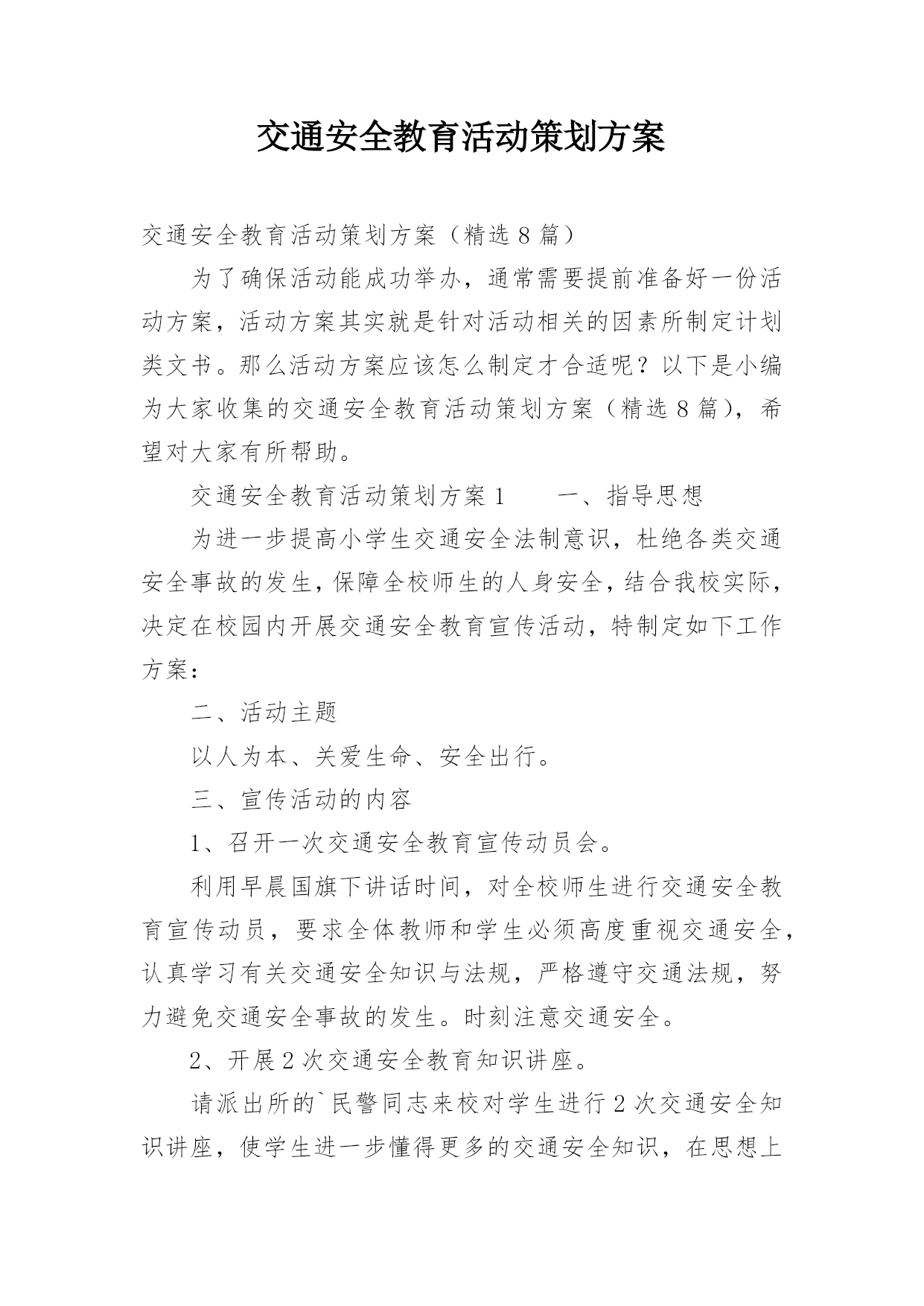 交通安全教育活动策划方案交通安全教育活动策划方案(精选8篇)为了确保活动能成功举办,通常需要提前准备好一份活动方案,活动方案其实就是针对活动相关的因素所制定计划类文书。那么活动方案应该怎么制定才合适呢?以下是小编为大家收集的交通安全教育活动策划方案(精选8篇),希望对大家有所帮助。交通安全教育活动策划方案1一、指导思想为进一步提高小学生交通安全法制意识,杜绝各类交通安全事故的发生,保障全校师生的人身安全,结合我校实际,决定在校园内开展交通安全教育宣传活动,特制定如下工作方案:二、活动主题以人为本、关爱生命