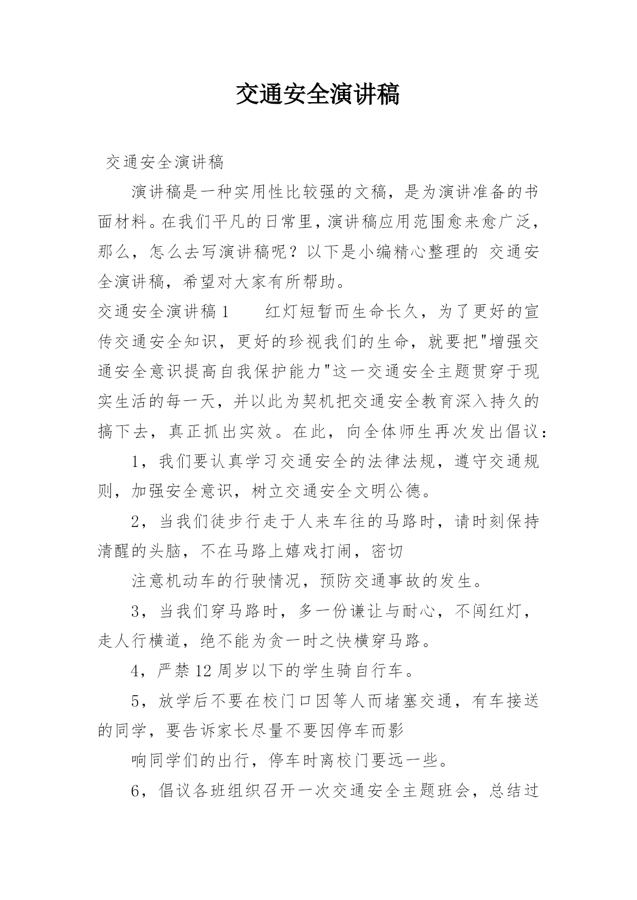交通安全演讲稿交通安全演讲稿演讲稿是一种实用性比较强的文稿,是为演讲准备的书面材料。在我们平凡的日常里,演讲稿应用范围愈来愈广泛,那么,怎么去写演讲稿呢?以下是小编精心整理的交通安全演讲稿,希望对大家有所帮助。交通安全演讲稿1红灯短暂而生命长久,为了更好的宣传交通安全知识,更好的珍视我们的生命,就要把"增强交通安全意识提高自我保护能力"这一交通安全主题贯穿于现实生活的每一天,并以此为契机把交通安全教育深入持久的搞下去,真正抓出实效。在此,向全体师生再次发出倡议:1,我们要认真学习交通安全的法律法规,遵守交