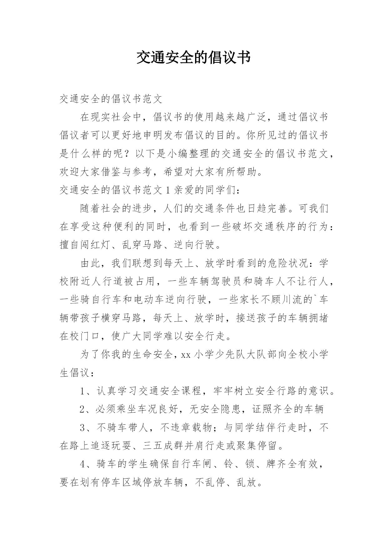 交通安全的倡议书交通安全的倡议书范文在现实社会中,倡议书的使用越来越广泛,通过倡议书倡议者可以更好地申明发布倡议的目的。你所见过的倡议书是什么样的呢?以下是小编整理的交通安全的倡议书范文,欢迎大家借鉴与参考,希望对大家有所帮助。交通安全的倡议书范文1亲爱的同学们:随着社会的进步,人们的交通条件也日趋完善。可我们在享受这种便利的同时,也看到一些破坏交通秩序的行为:擅自闯红灯、乱穿马路、逆向行驶。由此,我们联想到每天上、放学时看到的危险状况:学校附近人行道被占用,一些车辆驾驶员和骑车人不让行人,一些骑自行车和