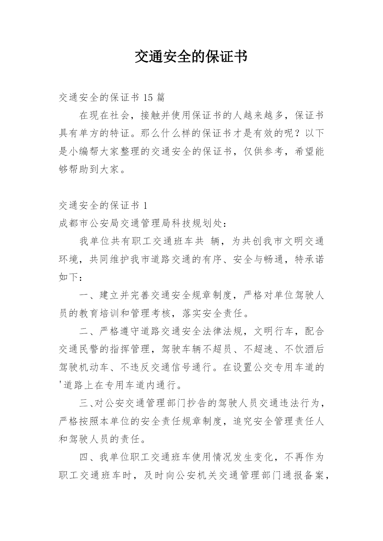 交通安全的保证书交通安全的保证书15篇在现在社会,接触并使用保证书的人越来越多,保证书具有单方的特证。那么什么样的保证书才是有效的呢?以下是小编帮大家整理的交通安全的保证书,仅供参考,希望能够帮助到大家。交通安全的保证书1成都市公安局交通管理局科技规划处:我单位共有职工交通班车共辆,为共创我市文明交通环境,共同维护我市道路交通的有序、安全与畅通,特承诺如下:一、建立并完善交通安全规章制度,严格对单位驾驶人员的教育培训和管理考核,落实安全责任。二、严格遵守道路交通安全法律法规,文明行车,配合交通民警的指挥管