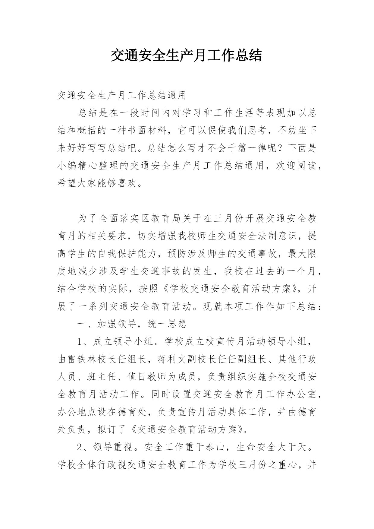 交通安全生产月工作总结交通安全生产月工作总结通用总结是在一段时间内对学习和工作生活等表现加以总结和概括的一种书面材料,它可以促使我们思考,不妨坐下来好好写写总结吧。总结怎么写才不会千篇一律呢?下面是小编精心整理的交通安全生产月工作总结通用,欢迎阅读,希望大家能够喜欢。为了全面落实区教育局关于在三月份开展交通安全教育月的相关要求,切实增强我校师生交通安全法制意识,提高学生的自我保护能力,预防涉及师生的交通事故,最大限度地减少涉及学生交通事故的发生,我校在过去的一个月,结合学校的实际,按照《学校交通安全教育活