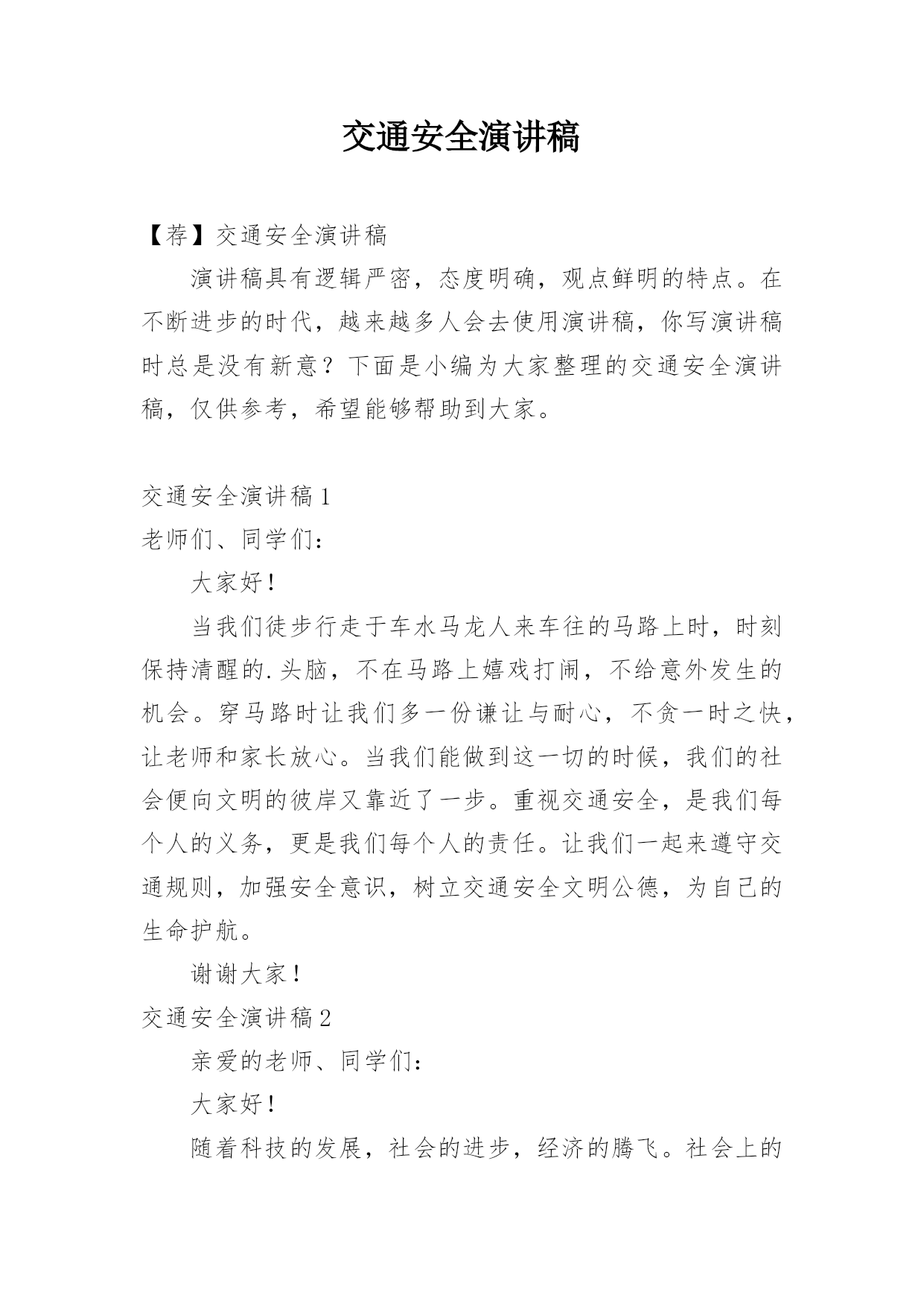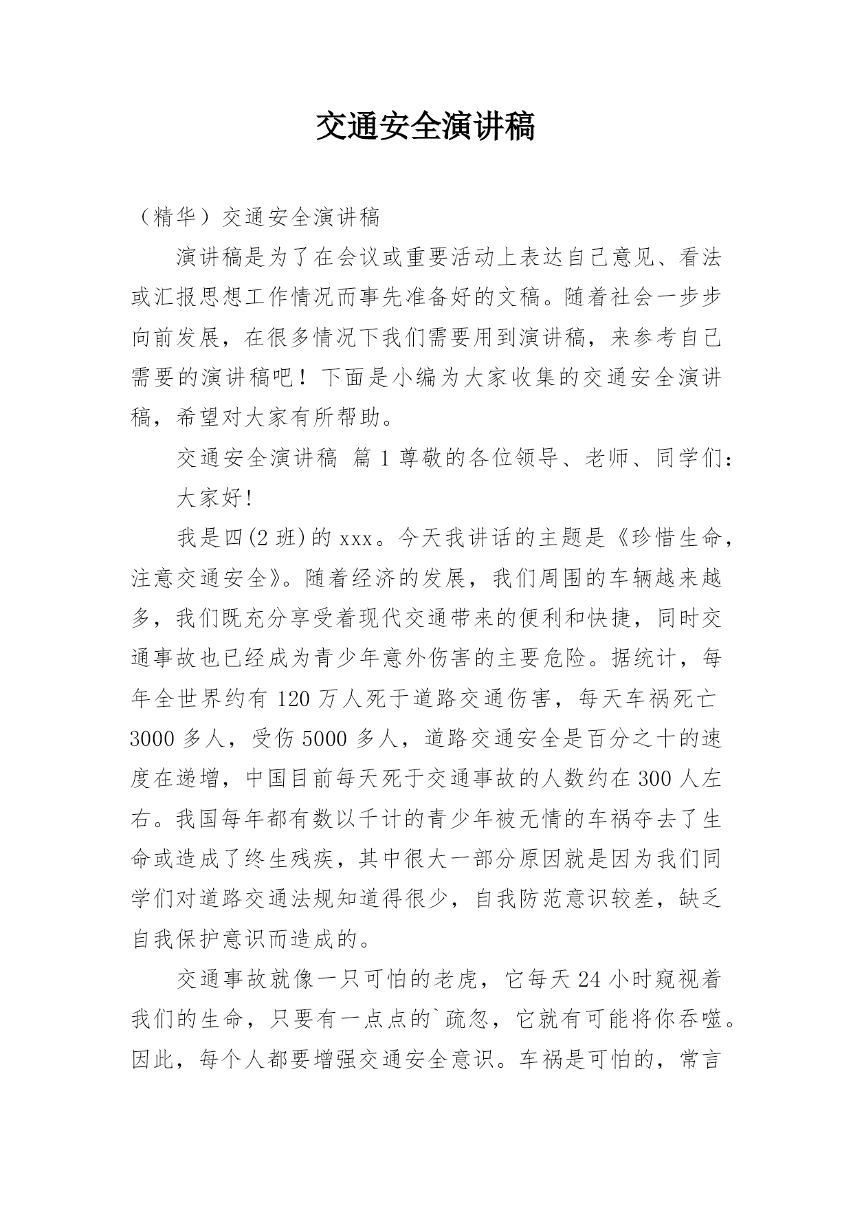 交通安全演讲稿(精华)交通安全演讲稿演讲稿是为了在会议或重要活动上表达自己意见、看法或汇报思想工作情况而事先准备好的文稿。随着社会一步步向前发展,在很多情况下我们需要用到演讲稿,来参考自己需要的演讲稿吧!下面是小编为大家收集的交通安全演讲稿,希望对大家有所帮助。交通安全演讲稿篇1尊敬的各位领导、老师、同学们:大家好!我是四(2班)的xxx。今天我讲话的主题是《珍惜生命,注意交通安全》。随着经济的发展,我们周围的车辆越来越多,我们既充分享受着现代交通带来的便利和快捷,同时交通事故也已经成为青少年意外伤害的主